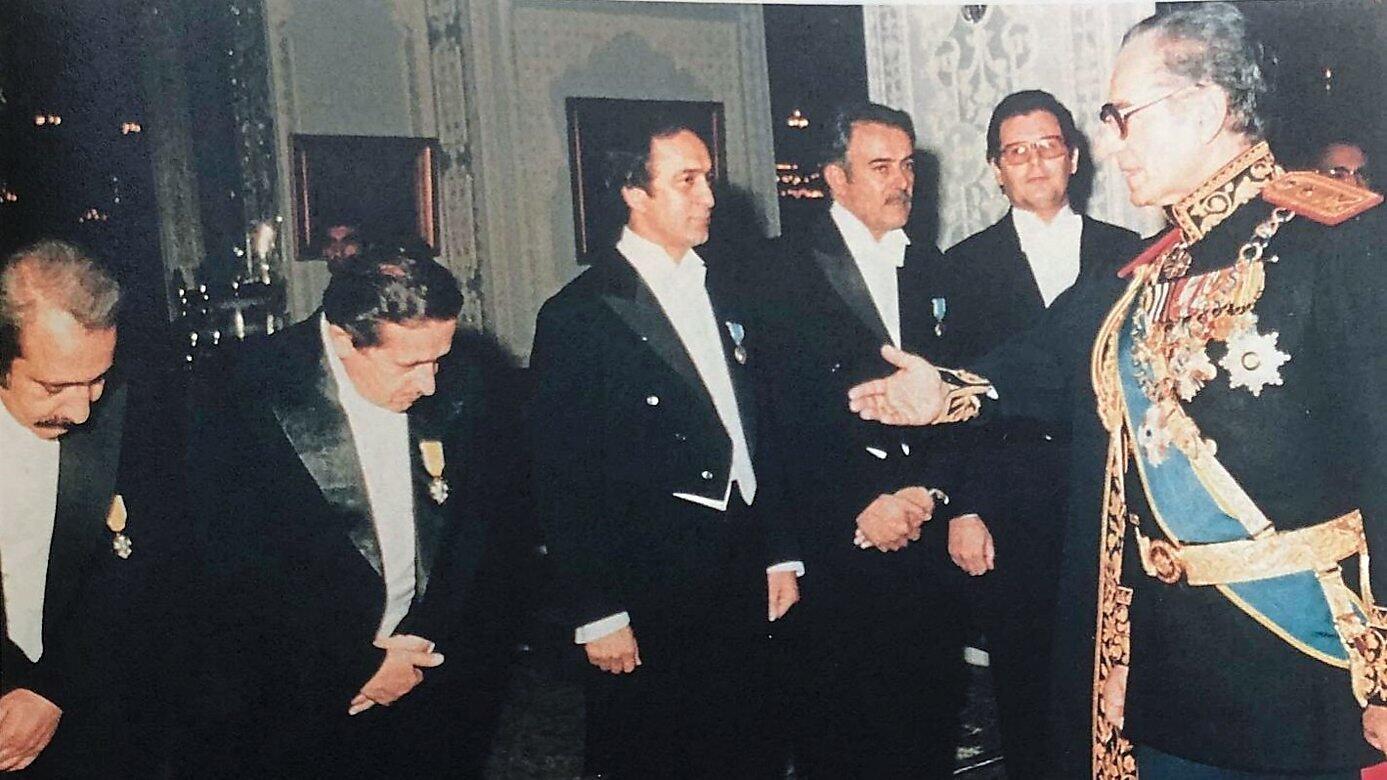 Dr. Massud Harun-Mahdavi (Bildmitte) als Bürgermeister in Teheran zum Neujahrs-Empfang mit dem Schah im Jahr 1977.