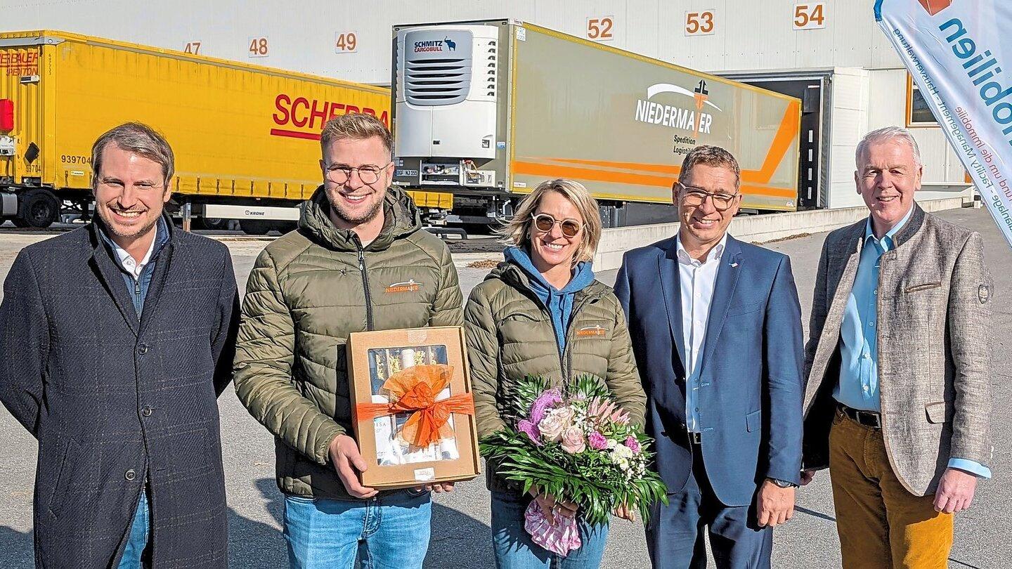 Mehr Platz für Auflieger: Auf den nächsten Expansionsschritt angestoßen haben Christian und Birgit Ach mit Bürgermeister Matthias Kohlmayer (l.) sowie Martin Able (2.v.r.) und Carsten Clemens (r). von der VR-Bank Landau-Mengkofen.