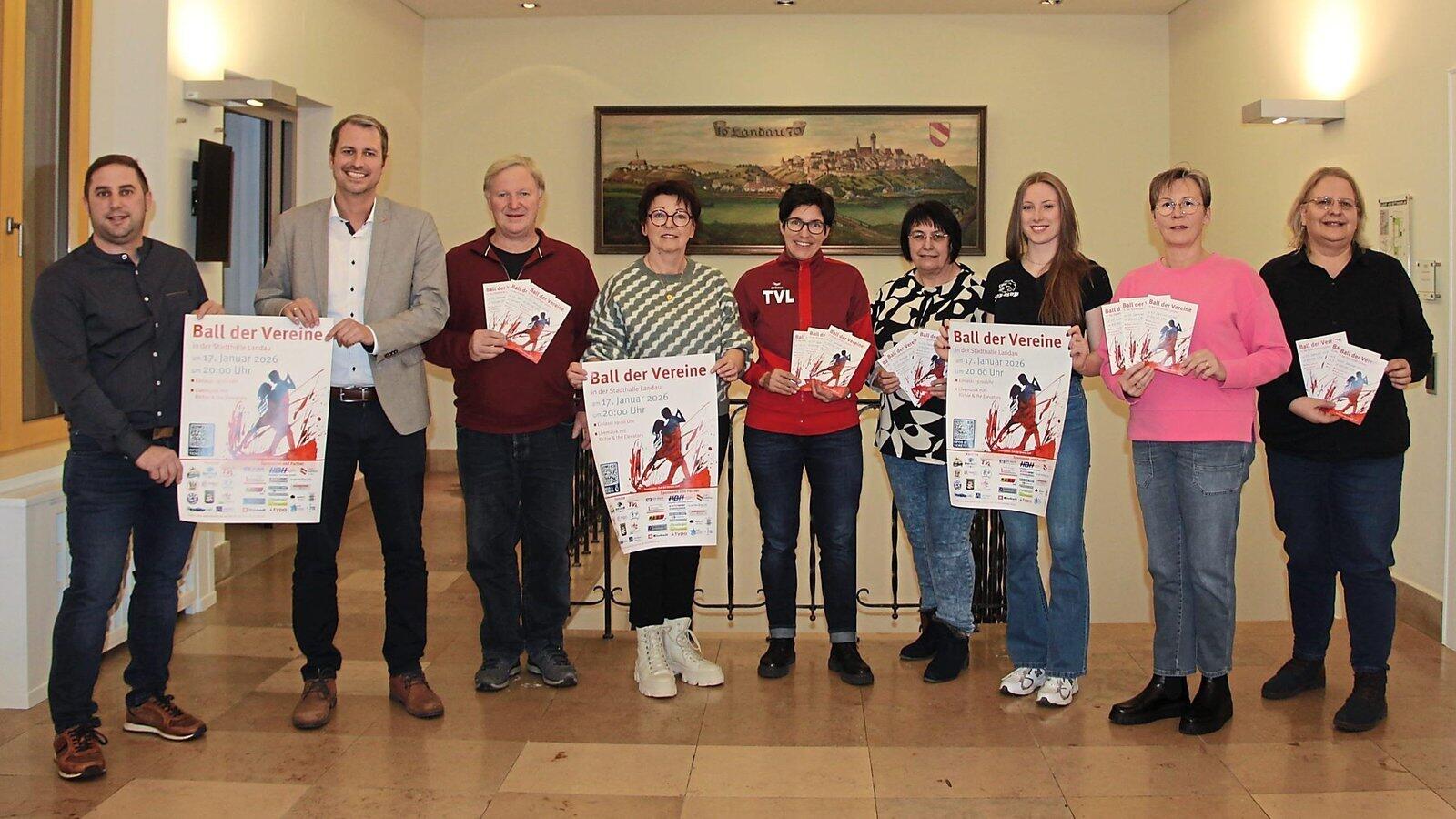 Die Vereinsvertreter präsentierten zusammen mit Hauptorganisatorin Heike Aichner (2.v.r.) und Bürgermeister Matthias Kohlmayer (2.v.l.) das Programm für den Ball der Vereine 2026.