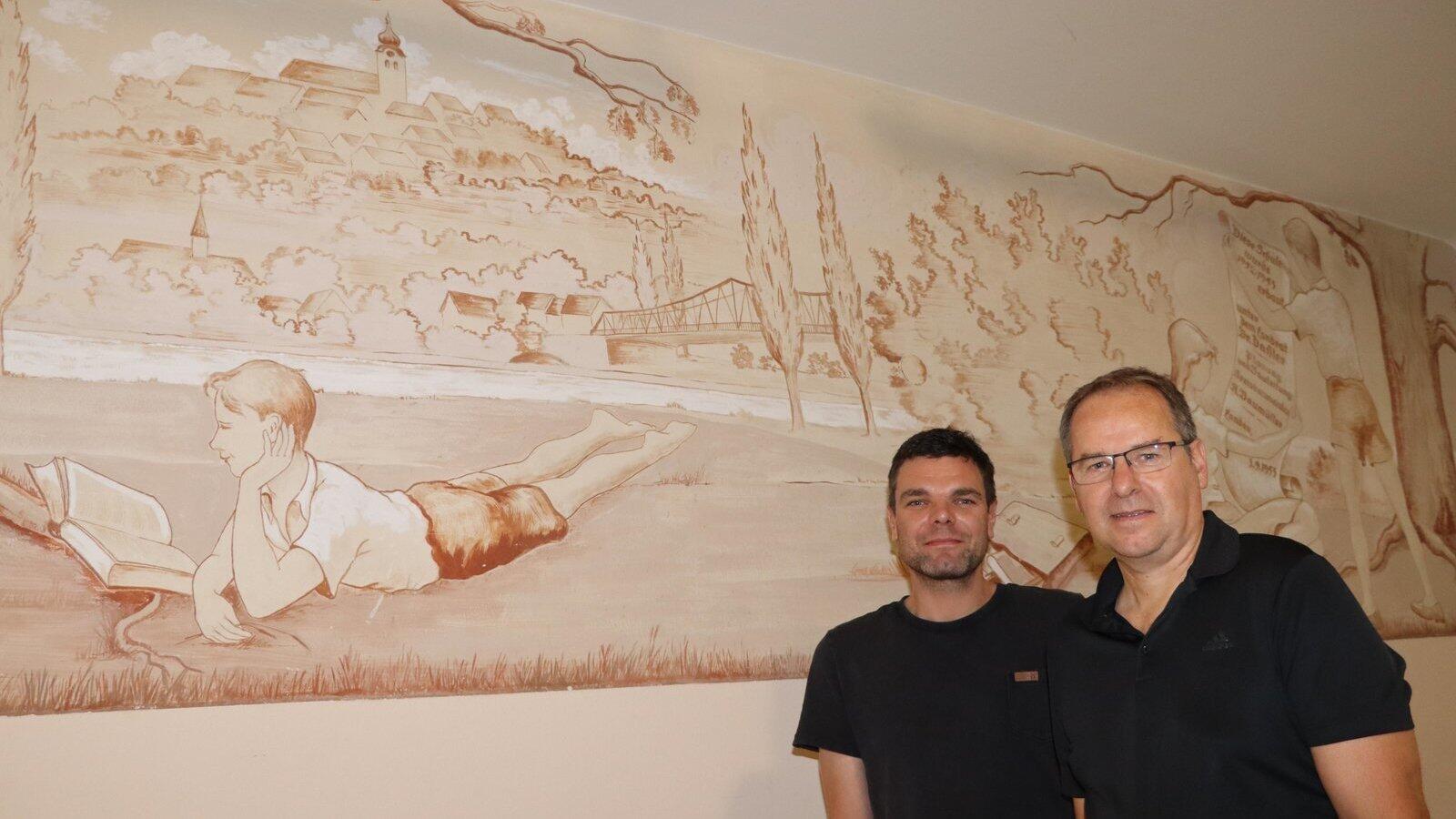 Schulleiter Alfred Reithmeier (r.) und Josef Plank von der erweiterten Schulleitung stehen vor einem Gemälde von Architekt Wilhelm Pfrogner aus dem Jahr 1953, das anlässlich des Neubaus der Schule am heutigen Standort entstand und noch immer den Schulflur ziert.