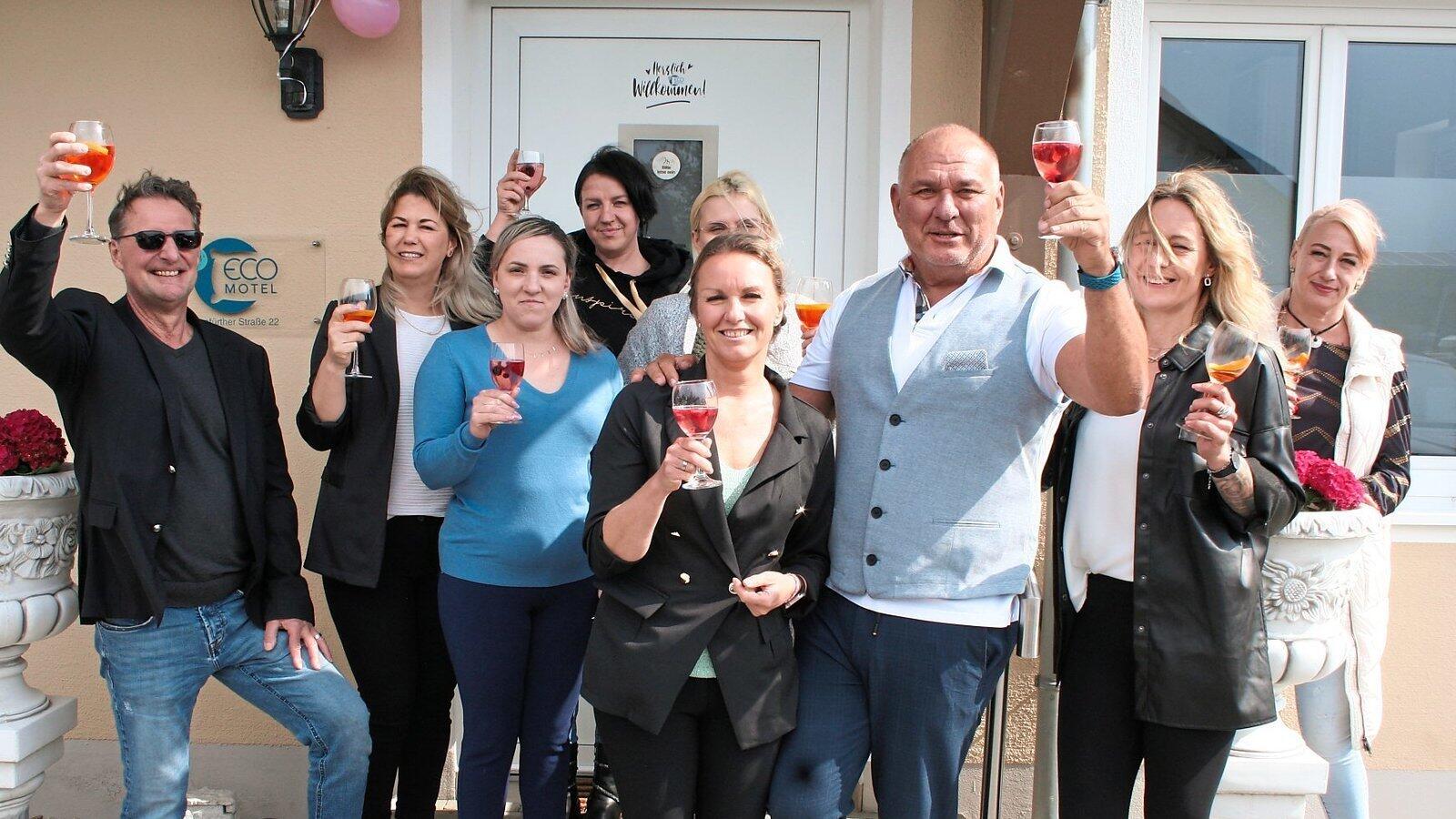Martin (3. v. r.) und Jana Petzenhauser (4. v. r.) stoßen mit Architekt Hermann Wutz und einigen Mitarbeitern auf die feierliche Eröffnung des Eco-Motels in Wallersdorf an. Dieses soll dem entgegenwirken, dass im Motel Isar in Pilsting die Zimmer nicht reichen.