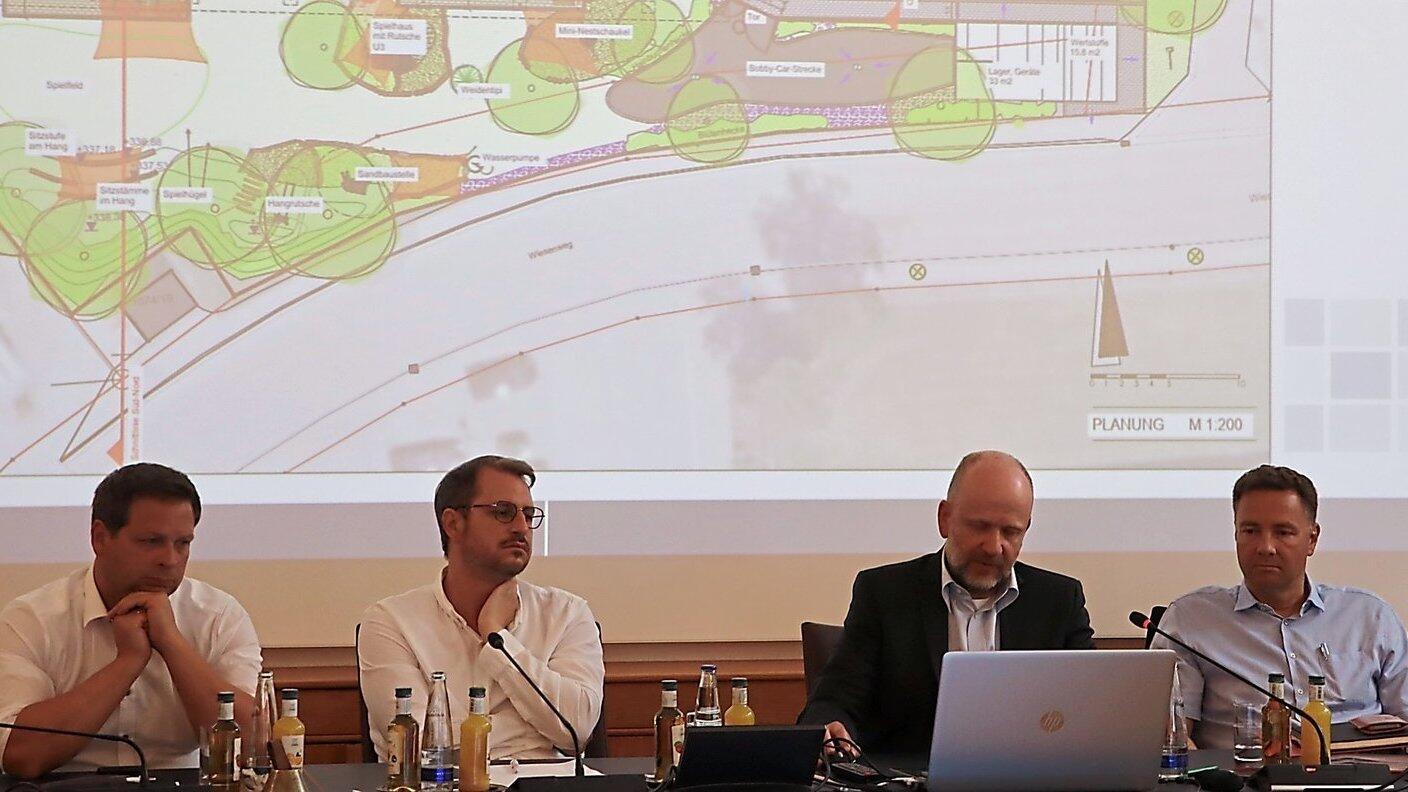Zweiter Bürgermeister Thomas Lorenz (v. l.) und Bürgermeister Matthias Kohlmayer verfolgten die Ausführungen der Planer Karl Kiendl und Joachim Wagner.