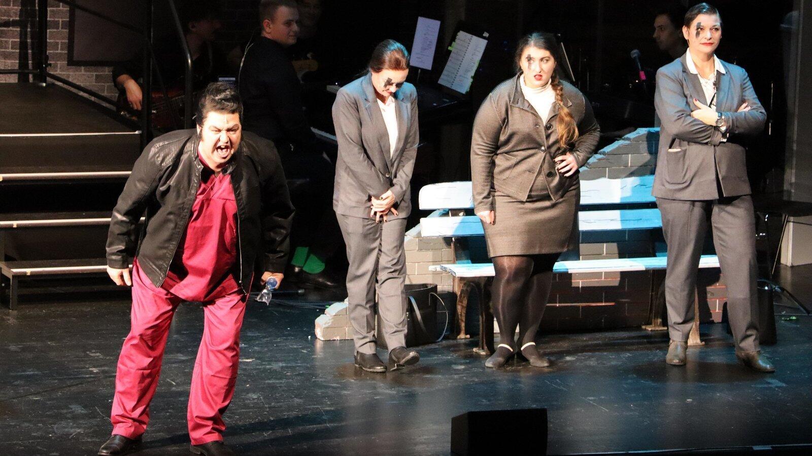 Achim Wimmer als fieser Zahnarzt Dr. Orin Scrivello, neben ihm die "Ronettes": Karin Hartenstein (v. l.), Barbara Roscher und Diana Wimmer.