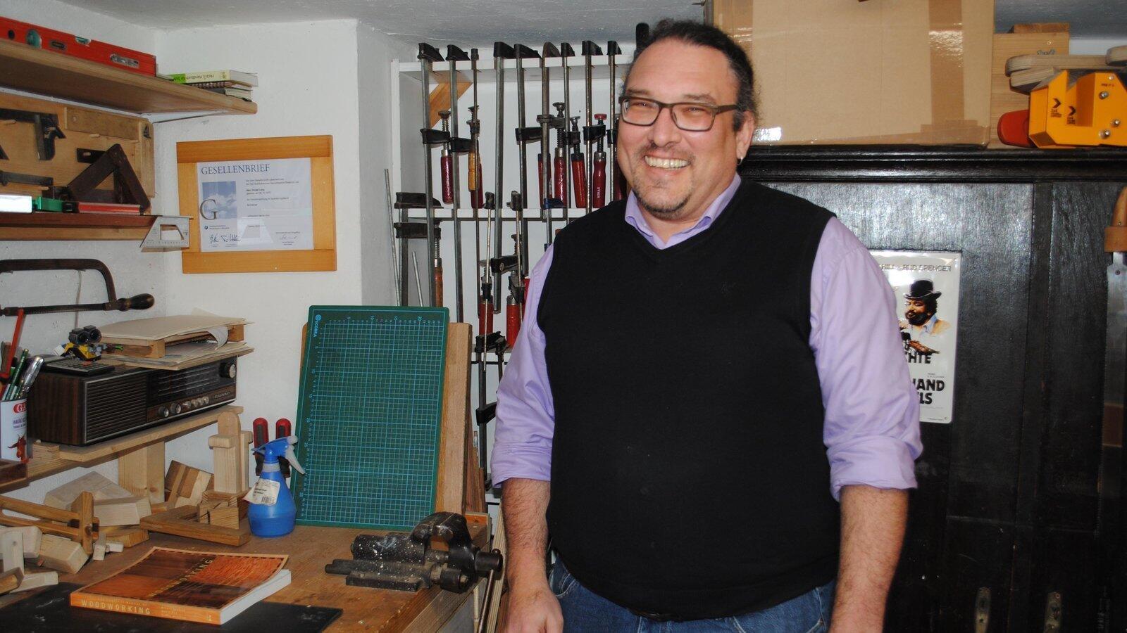 „Meine Werkstatt ist der Ort, wo ich mich am wohlsten fühle“, sagt Daniel Lang. Er tritt am 8. März für die SPD als Bürgermeisterkandidat an.