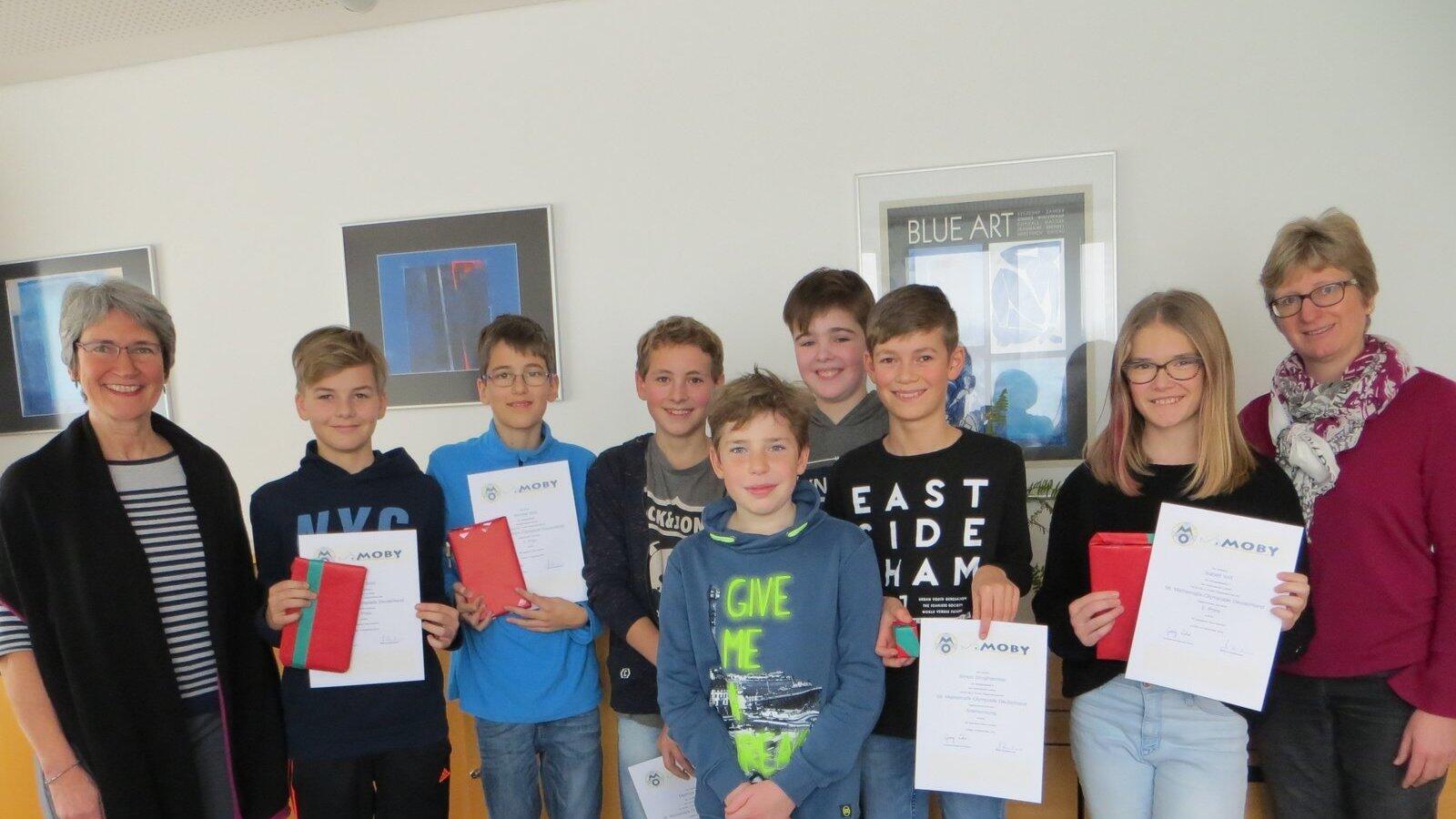 Schulleiterin Cornelia Feldkamp (v.l.), die erfolgreichen Schüler, Mathematiklehrerin Marlene Bachmeier (r.).