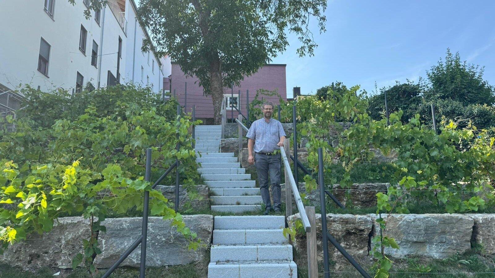 Bauamtsleiter Michael Schmidt-Ramsin nascht einige Weintrauben. Beim Pressetermin am öffentlich zugänglichen Weinberg am Stadtgraben macht er den Test: So schmecken Landaus Weintrauben.
