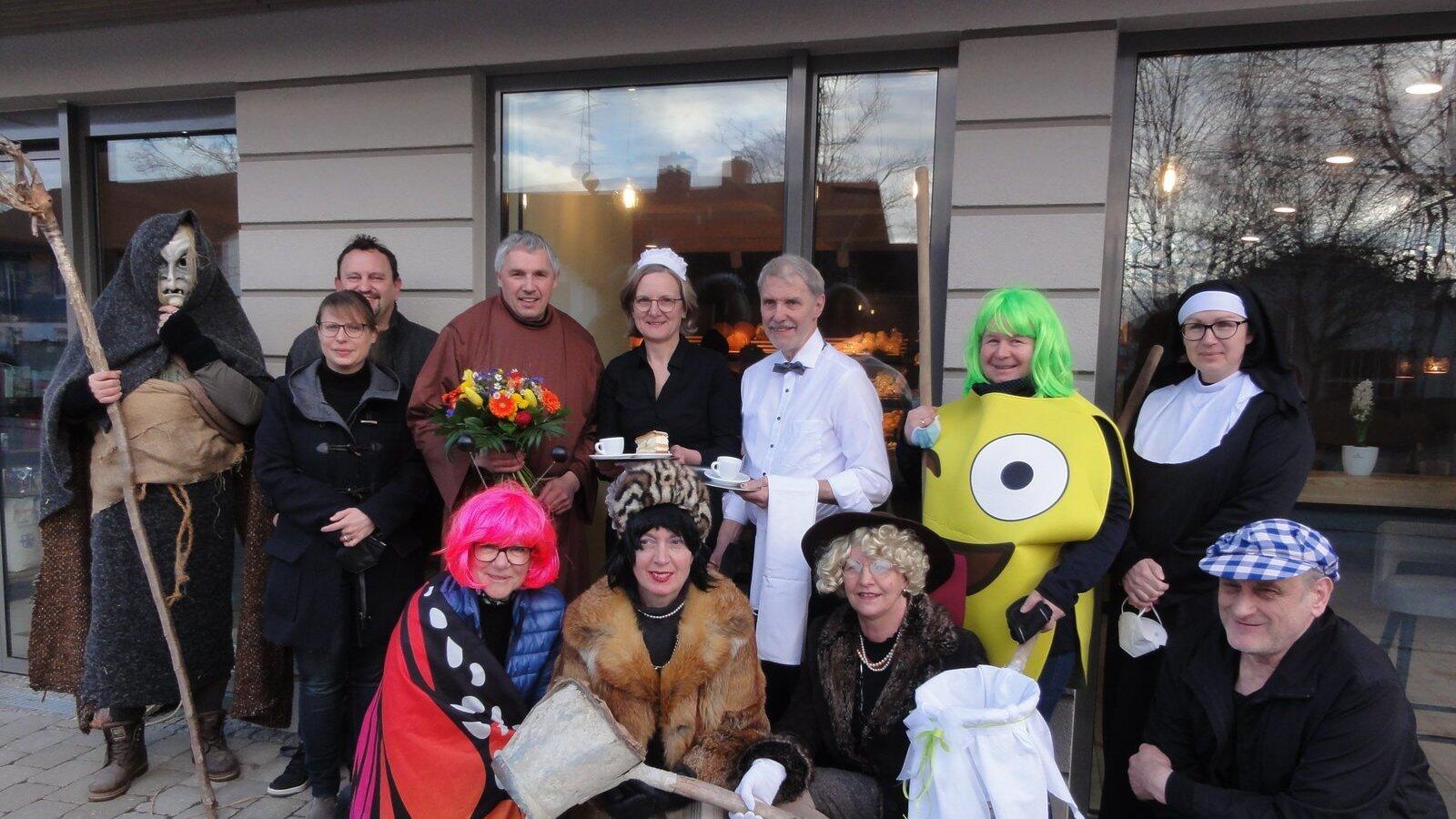 Die Hausherren des neuen Tagescafés überraschten die Zeitungsausträger mit einem Empfang. Die Bäckerei Bittner unterstützt seit Jahrzehnten den Verkauf der Mariakirchener Faschingszeitung.