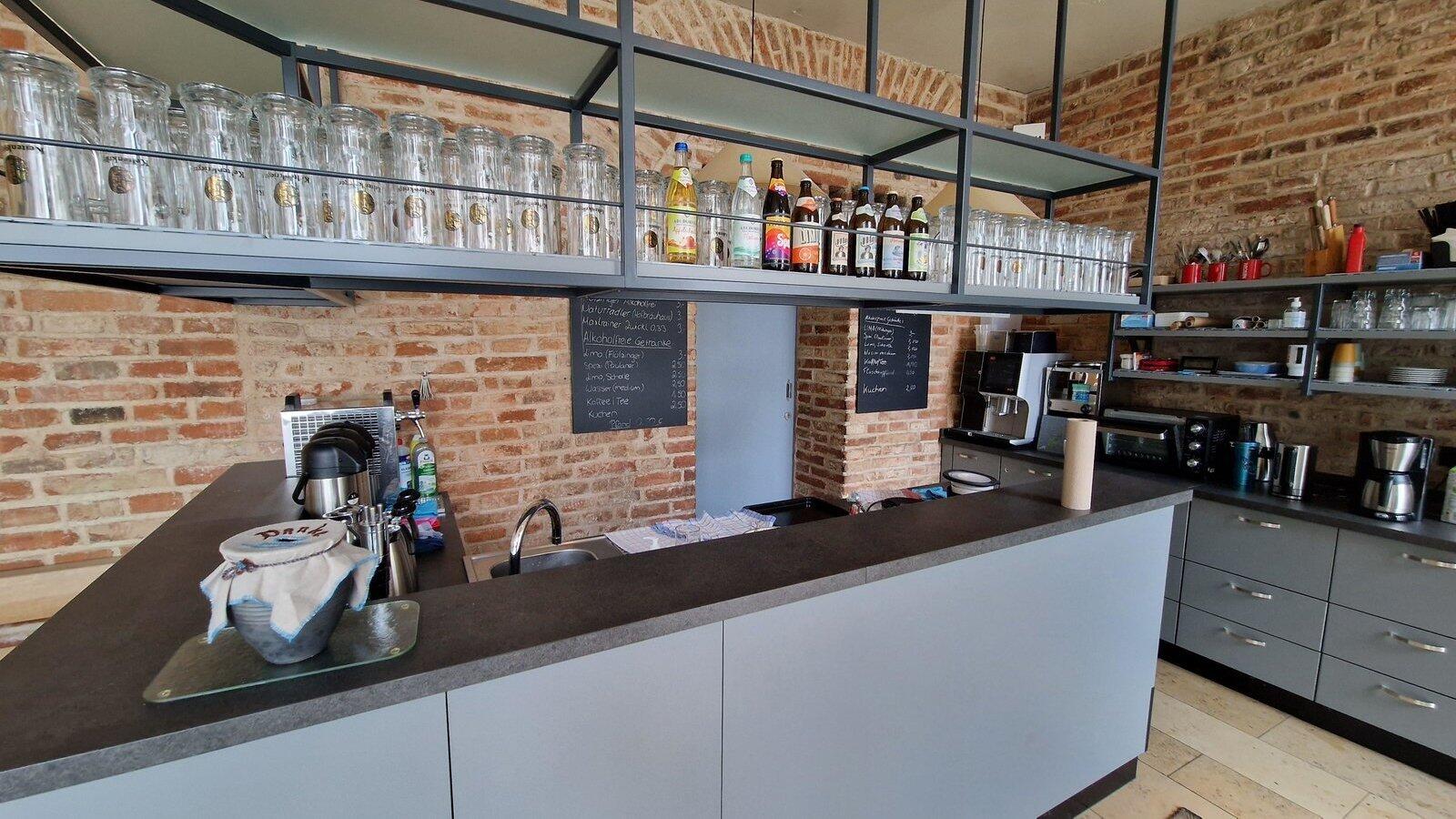 Der Tresen in der Kastenhof-Gastronomie, dahinter befindet sich die Küche: Ein langer Schlauch, bei dem sich mehrere Personen beim Kochen auf die Füße treten und daher nur ein eingeschränktes Angebot möglich ist. Das schreckt viele ab.