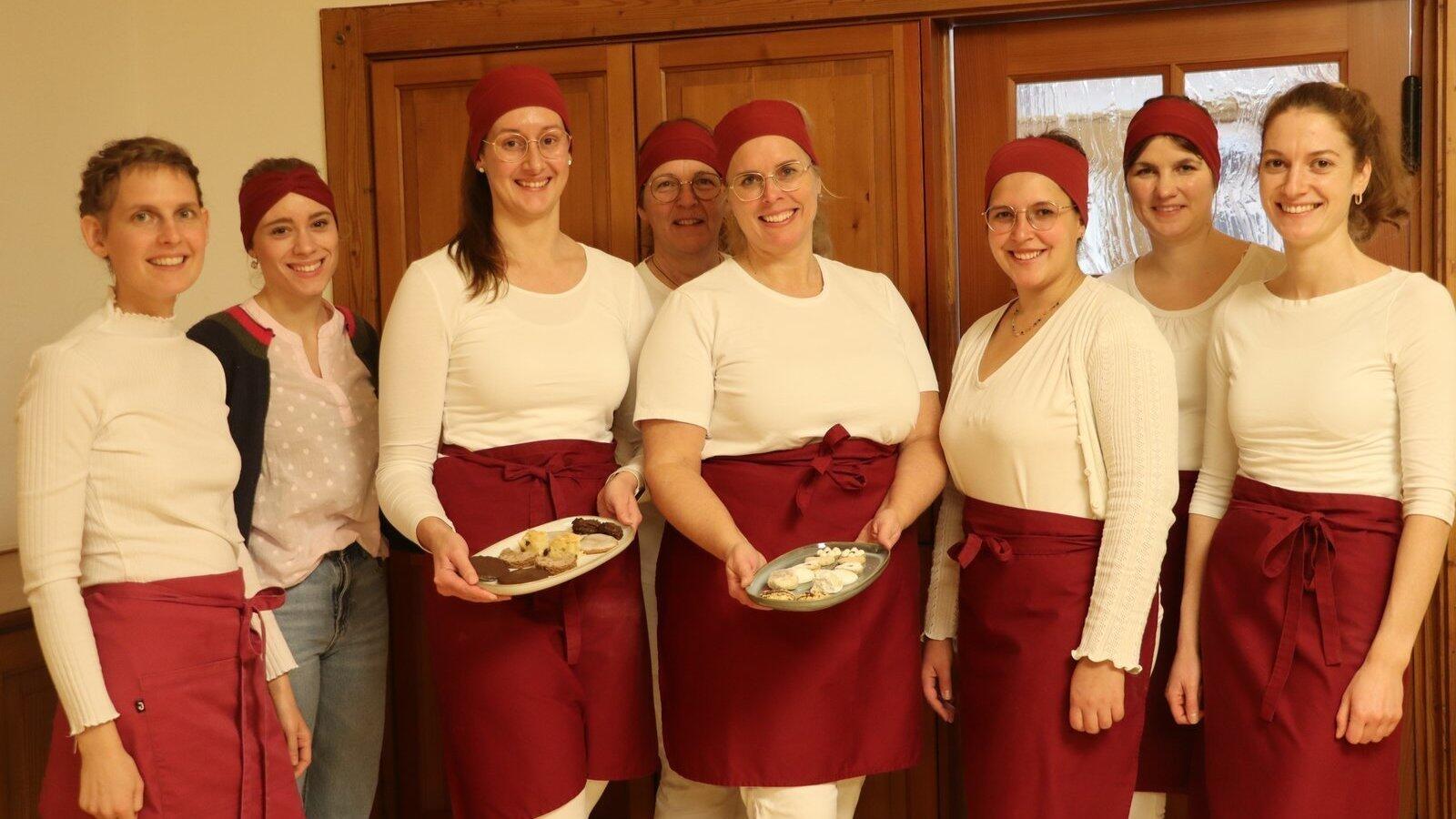 Freuen sich über die vielen verschiedenen Backwerke: Lehrerin Katharina Beer (v.l.), Fachlehreranwärterin Magdalena Maurer und die Studentinnen Eva Dittrich, Manuela Kerscher, Christine Kreuzpaintner, Katharina Dachs, Franziska Angstl und Veronika Blindauer.