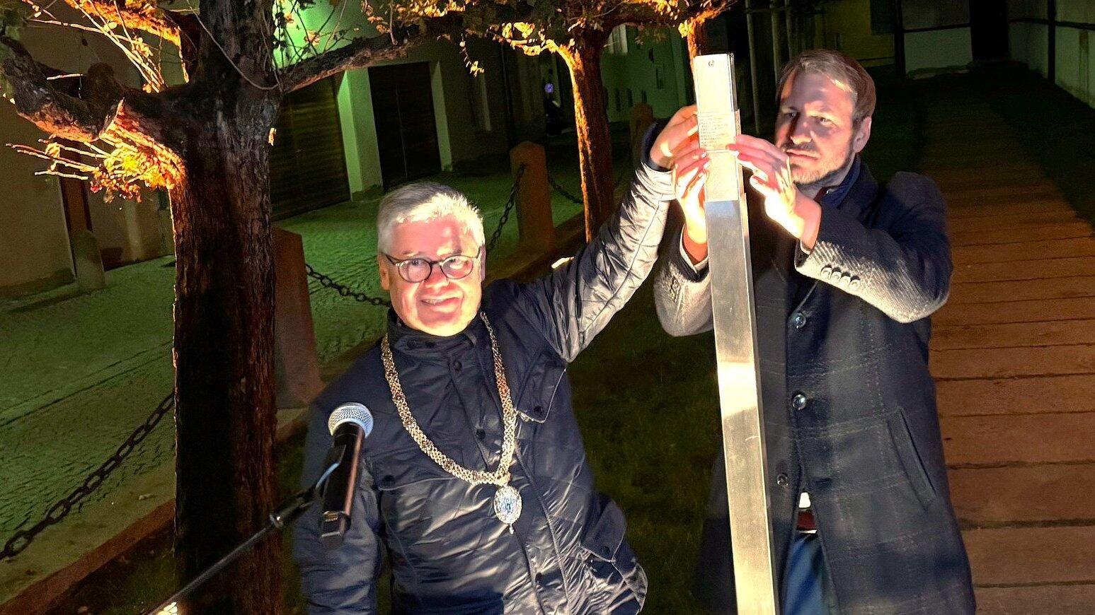 Zur Feierstunde kam als Ehrengast aus München in Vertretung für Oberbürgermeister Dieter Reiter der Stadtrat Winfried Kaum (l.) nach Landau, rechts Landaus Bürgermeister Matthias Kohlmayer. Das Design der Stele stammt von der Münchner Designagentur „stauss processform“.