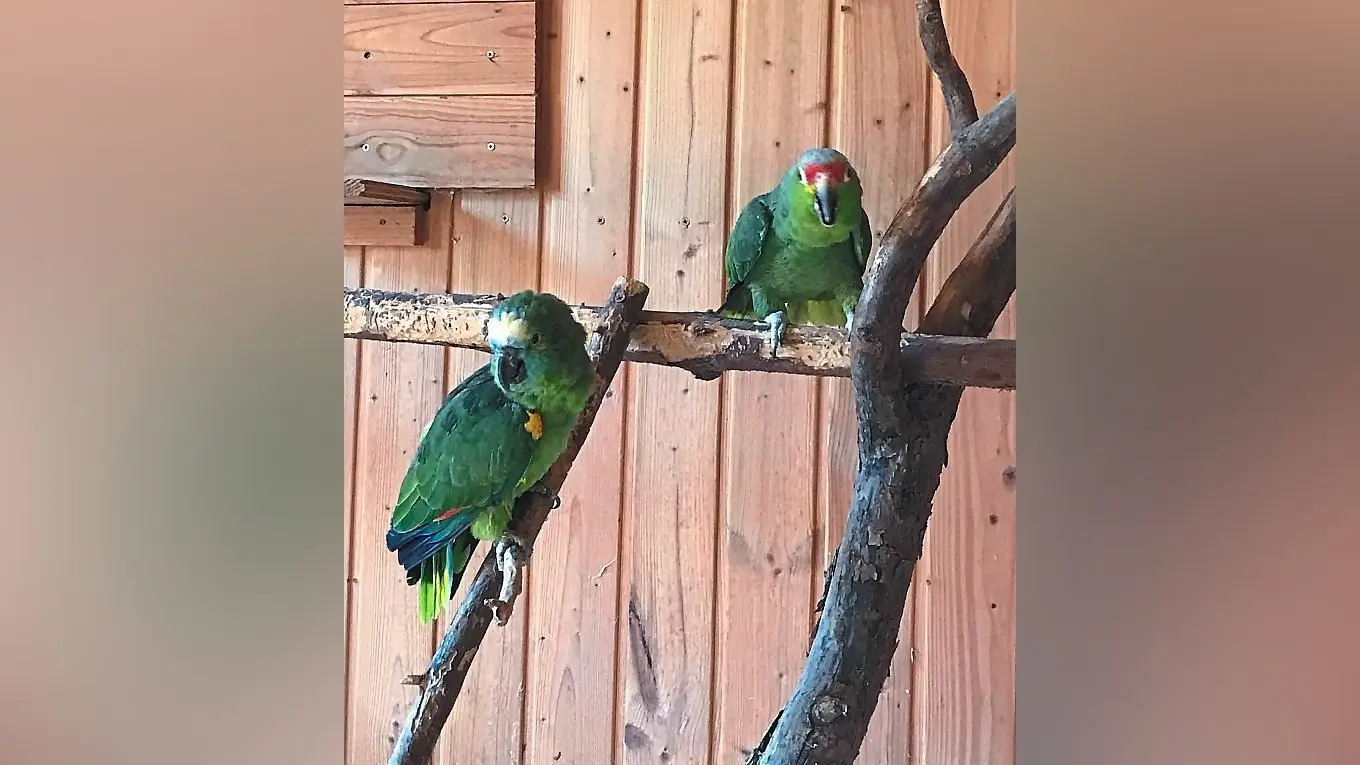 Das Amazonenpärchen Moni und Toni sucht dringend ein neues Zuhause. Sie wurden einst in einer kleinen, schmutzigen Voliere auf einem Parkplatz ausgesetzt und 2011 vom Quellenhof vermittelt. Allerdings kann sich ihr Halter aus gesundheitlichen Gründen nicht mehr um die beiden kümmern. Gelbwangenamazone Toni ist flugfähig. Er kümmert sich sehr um seine Moni und füttert sie auch mit. Blaustirnamazone Moni kann nicht fliegen, hüpft aber auf den Ästen umher. Sie kann sprechen. Sie ist schon immer etwas klein im Wuchs. Die beiden sind etwa 30/31 Jahre alt. Sie sind nicht handzahm, lassen sich jedoch aus der Hand füttern. Sie sind unzertrennlich. Beide baden gern. Sie kennen und lieben alles an Futter wie Körner, Obst, Gemüse, Äste zum Knabbern. Sie sind gechipt und registriert 1und PBFD-negativ getestet.