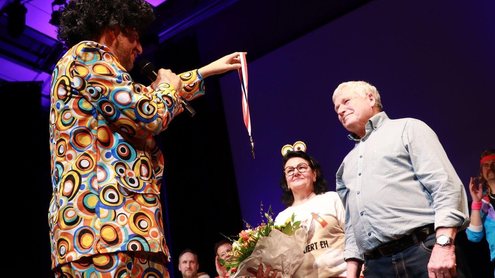 Bürgermeister Matthias Kohlmayer überreicht Xaver Hagn den Ehrenorden. Er ist seit 36 Jahren im Stadtrat - und auch bei der Unsinnigen Stadtratssitzung nicht wegzudenken. Seine Frau Mia ist seit zwölf Jahren dabei.