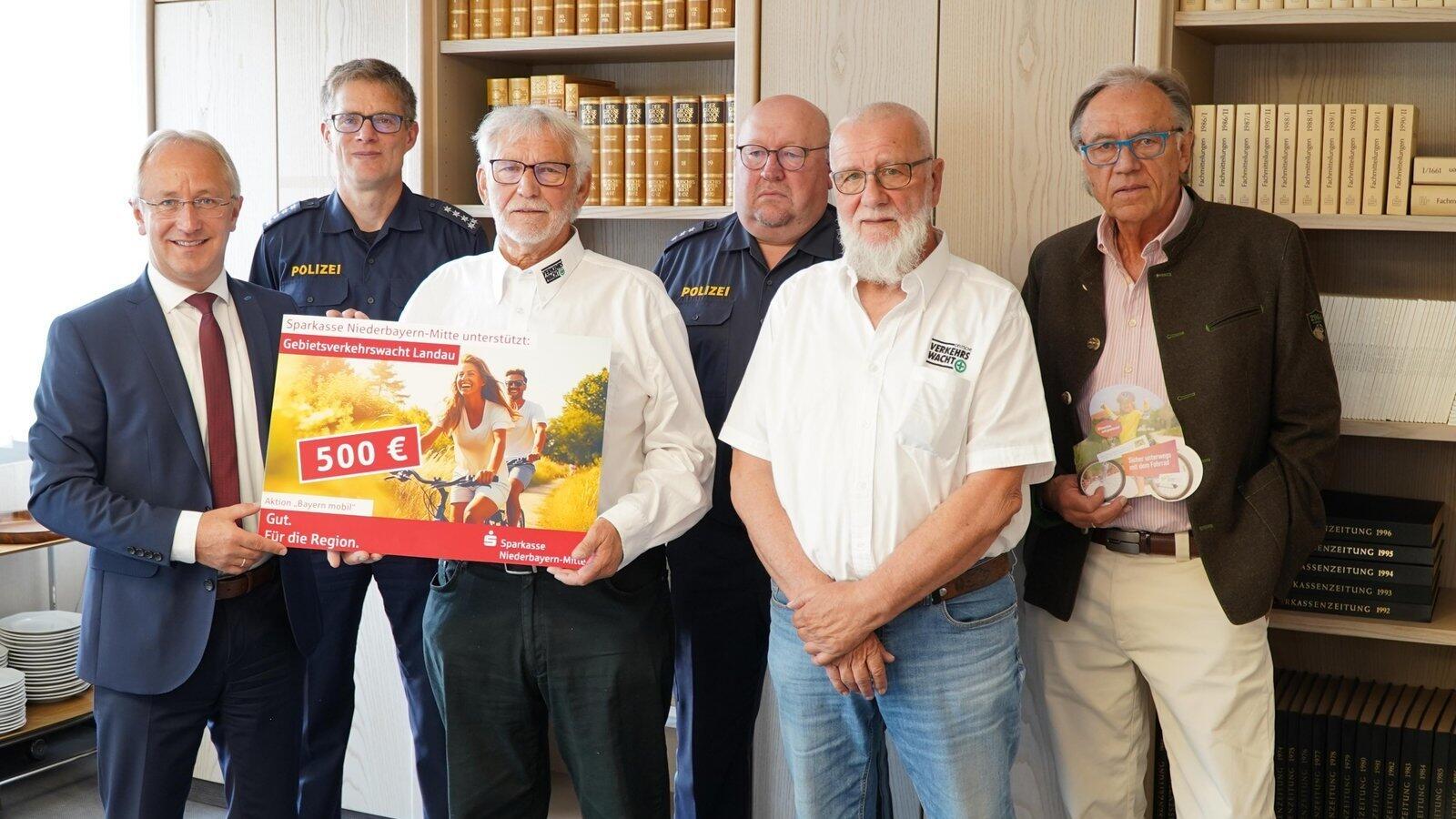 Robert Elsberger (v. l.), Stephan Lehner, Josef Beer, Helmut Mühlberger, Manfred Weiß und Gerold Zeus bei der Übergabe von 500 Euro an die Gebietsverkehrswacht.