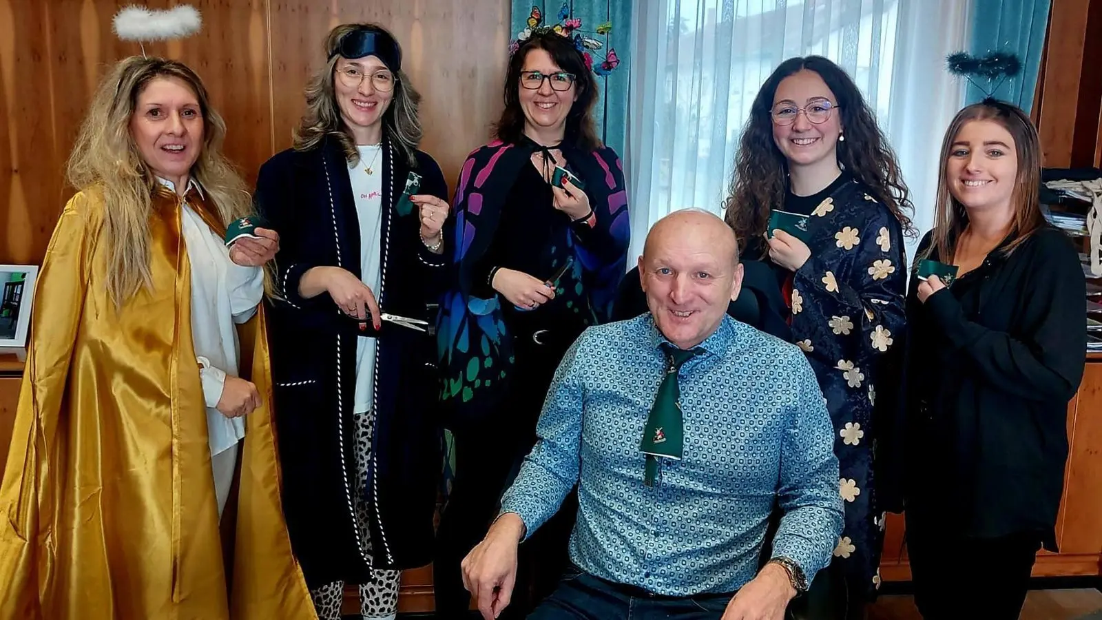 Es wurden Lieder gesungen und eine Polonaise durchs Rathaus getanzt. Bürgermeister Franz Aster zeigte sich sehr erfreut über den närrischen Kinderbesuch, auch, wenn der Süßigkeitenvorrat komplett geplündert wurde. Als wäre das noch nicht genug: Auch die Scheren machten vor dem Rathauschef nicht Halt. Mitarbeiterinnen der Marktgemeinde Wallersdorf erschienen maskiert im Büro des Bürgermeisters. Sogleich fiel seine Krawatte der Schere zum Opfer. Jede der Damen behielt sich ein Stück davon als Trophäe. Bürgermeister Franz Aster nahm das Ganze mit Humor. Er hatte sich bereits am morgen zuhause eine besonders schöne Krawatte mit Elchen und Rentieren ausgesucht.