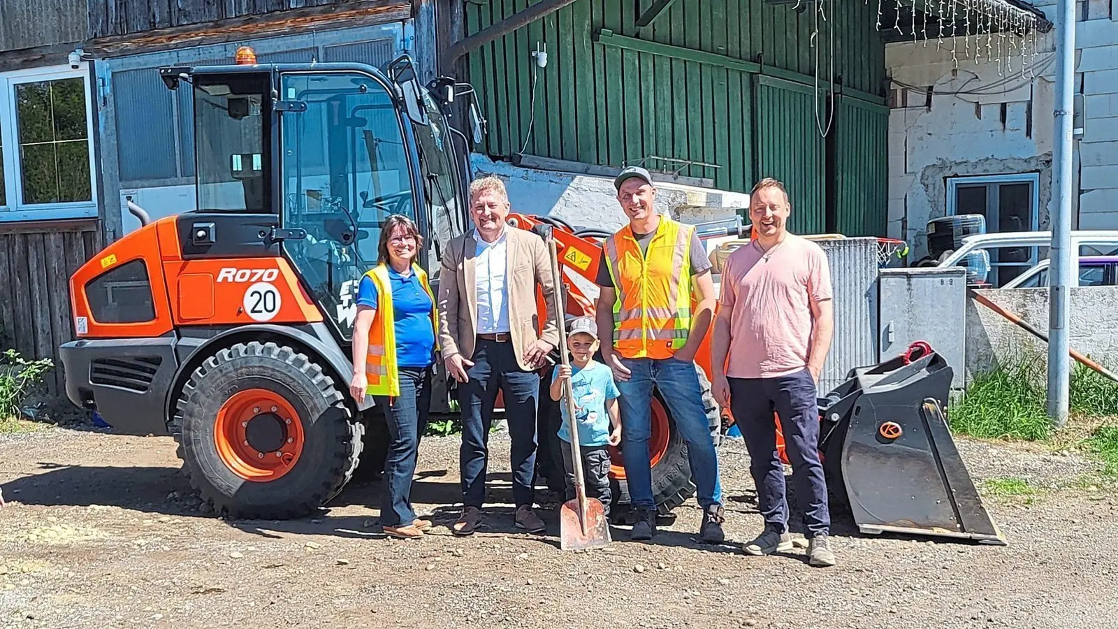 Bauamtsleitung Sabine Forstner, Bürgermeister Josef Beham, Nachbarsbub und Baustellenfan Korbinian Kalinke, Bauleiter Andreas Sterr und Planer Josef Steinhofer beim Baubeginn.