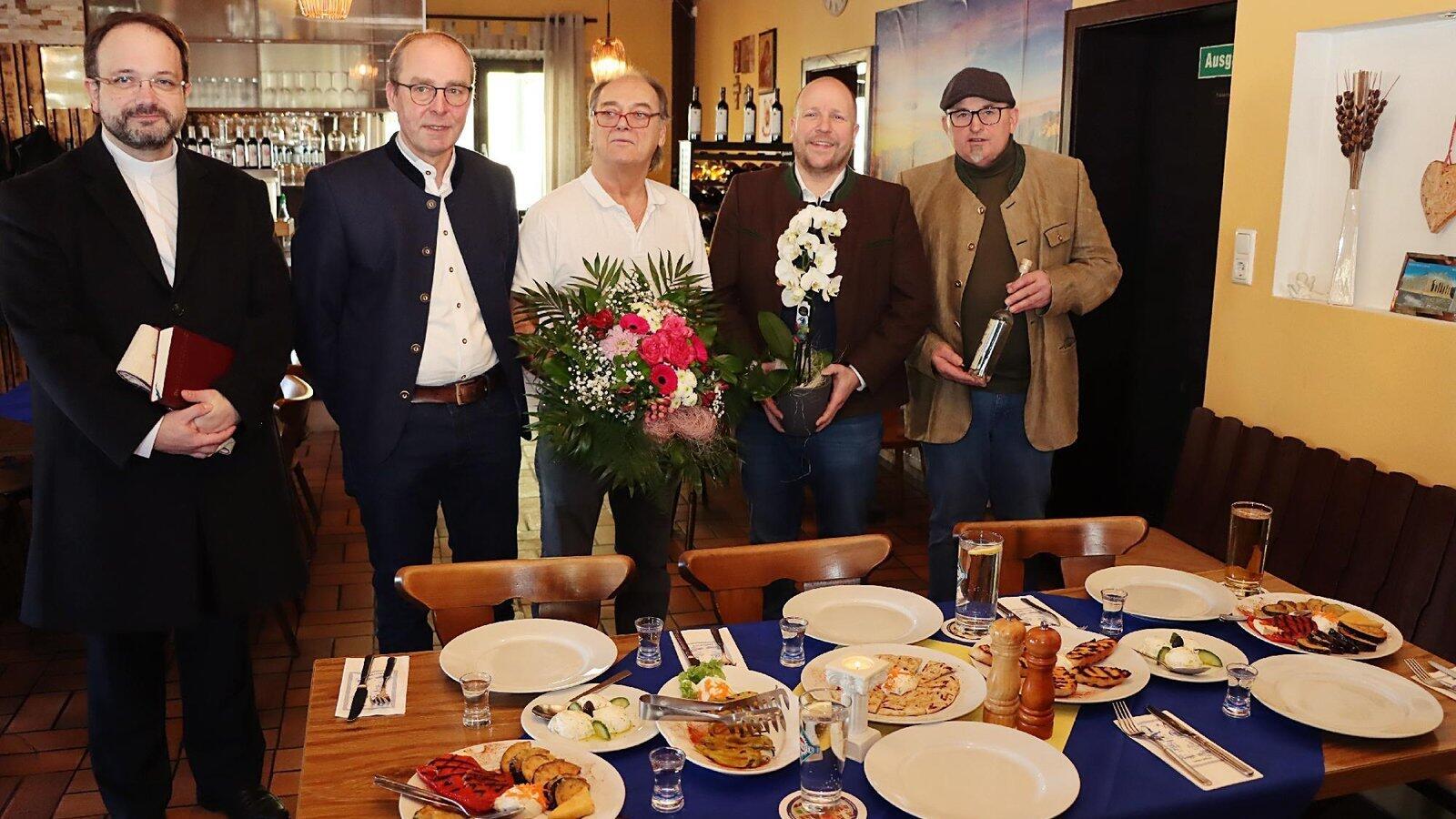 Mit Präsenten und Glückwünschen im Gepäck haben Dekan Jürgen Josef Eckl, Bürgermeister Martin Hiergeist, Michael Sturm und Robert Dullinger, Gebietsverkaufsleiter der Brauerei Graf Arco Adldorf, am Dienstag den Gastwirt