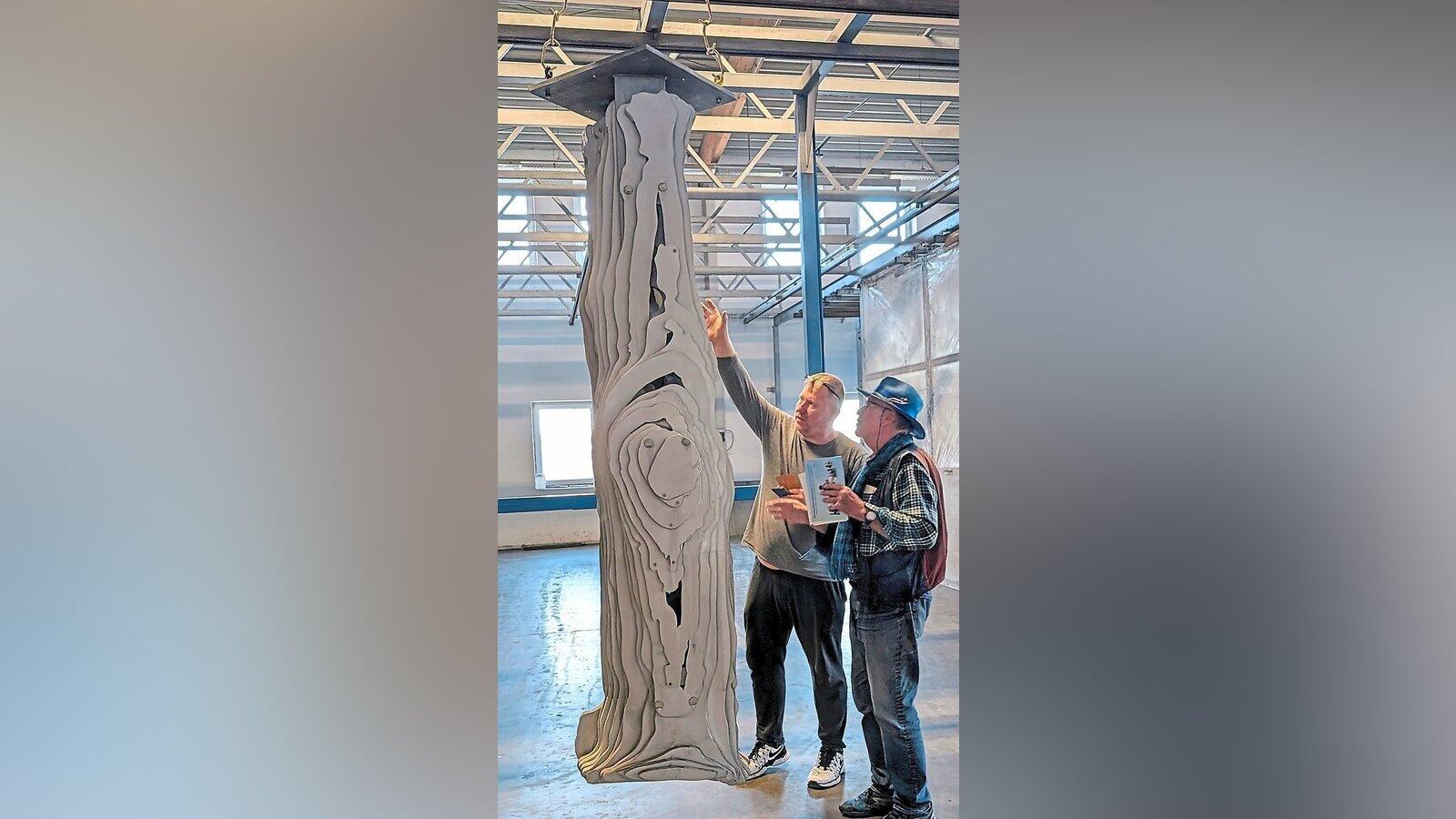 Noch viel Arbeit bis Sonntag: „Black Pearl“. Geschäftsführer Edward Wysokinski und Gerhardt Kadletz besprechen die Pulverbeschichtung der Statue, die kopfüber aufgehängt ist.