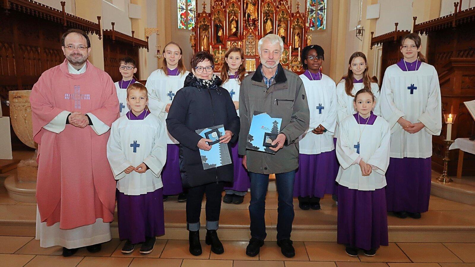 Maria Hertreiter und Albert Pöschl (M.) mit Dekan Jürgen Josef Eckl und den Ministranten