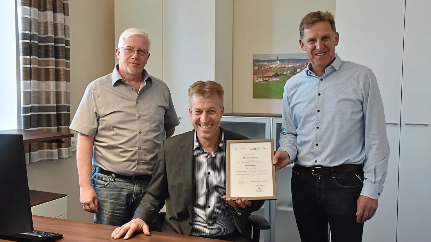 Schlüsselübergabe im Rathaus: Für Herbert Sporrer war der Donnerstag der letzte Tag seiner Amtszeit als Bürgermeister des Marktes Simbach. Nachfolger Anton Sporrer nimmt mit Freitag, 1. Mai, seine Tätigkeit auf. Er durfte im Beisein von Geschäftsleiter Alexander Pichlmaier aus der Hand von Herbert Sporrer die Ernennungsurkunde entgegennehmen. Somit ist er für die Periode von sechs Jahren zum Beamten berufen.