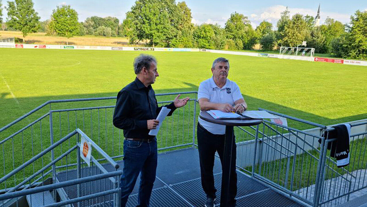Bürgermeister Peter Eisgruber-Rauscher (links) mit dem TSV-Vorsitzenden Richard Bergmoser (rechts) auf der Tribüne des TSV-Häusl.