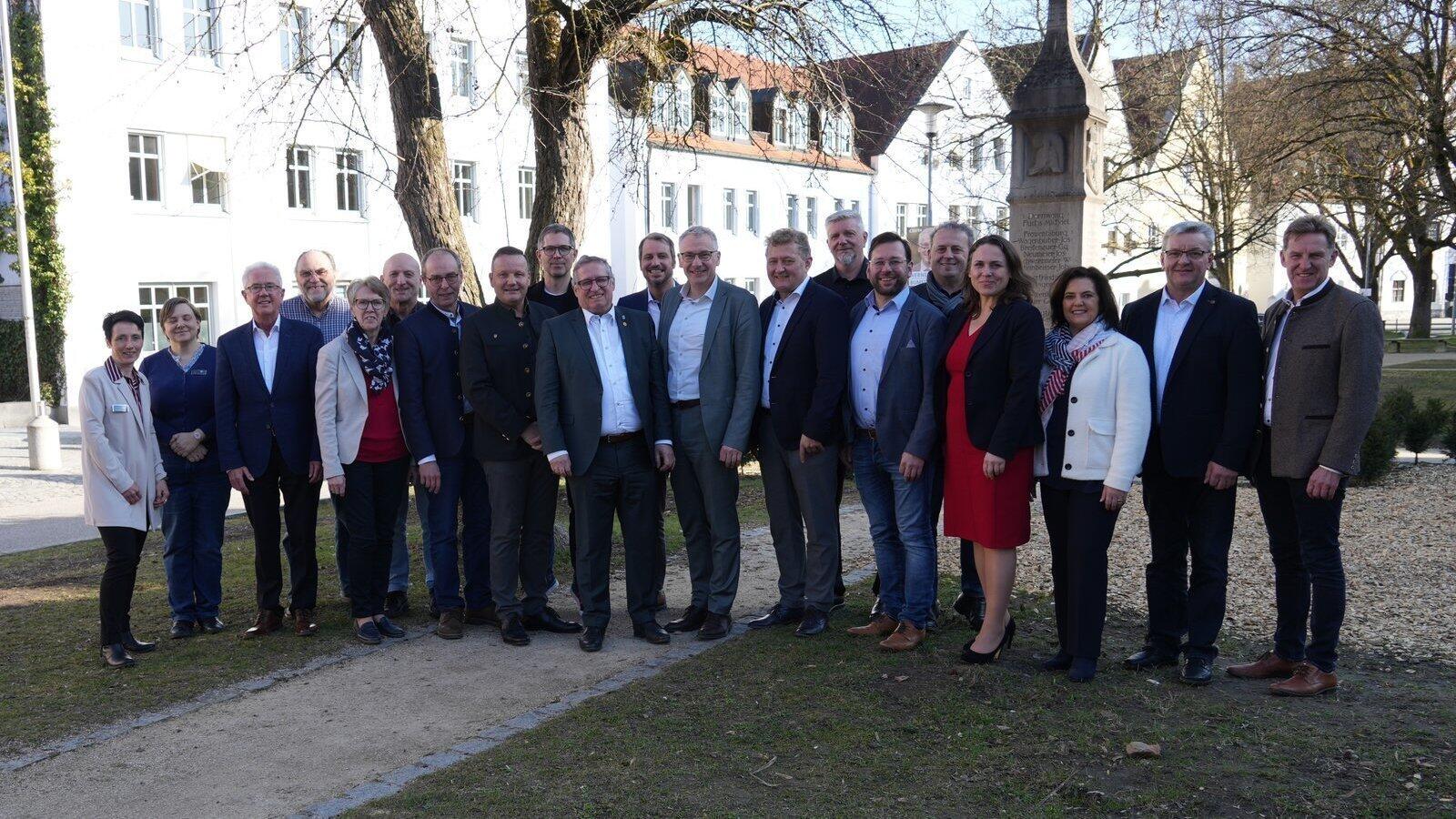 Landrat Werner Bumeder und Bürgermeistersprecher Günter Schuster mit den Bürgermeistern der Landkreiskommunen sowie den Referenten der Tagung