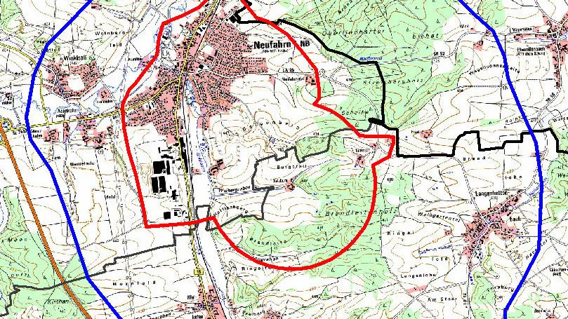 Das Veterinäramt am Landratsamt Landshut hat den ursprünglichen Sperrbezirk (rote Linie) wegen des Ausbruchs der Bienen-Seuche Amerikanische Faulbrut deutlich erweitert, auf drei Kilometer im Umkreis des Ausbruchsorts (blaue Linie).