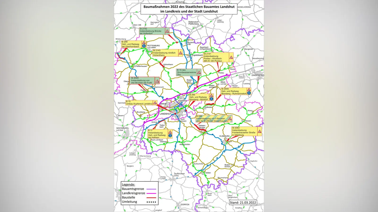 - Verkehrsbehinderungen: Die Arbeiten finden unter Vollsperrung des Verkehrs statt. Die Umleitungen werden rechtzeitig auf den Online-Auftritten des Staatlichen Bauamts und der Stadt Vilsbiburg bekannt gegeben.