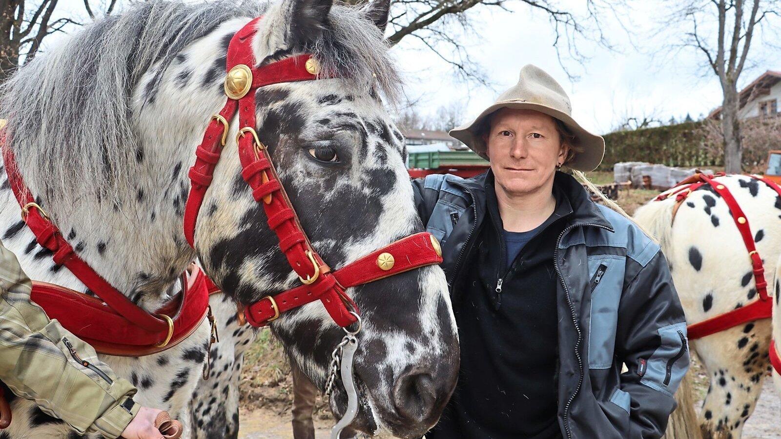 Rambo kaut gemächlich an einem Büschel Heu. Die Hand, die ihm durch die Gitterstäbe seiner Box entgegengestreckt wird, beschnuppert der 15-jährige Norikerhengst unbeeindruckt und schiebt dann fordernd die Oberlippe über