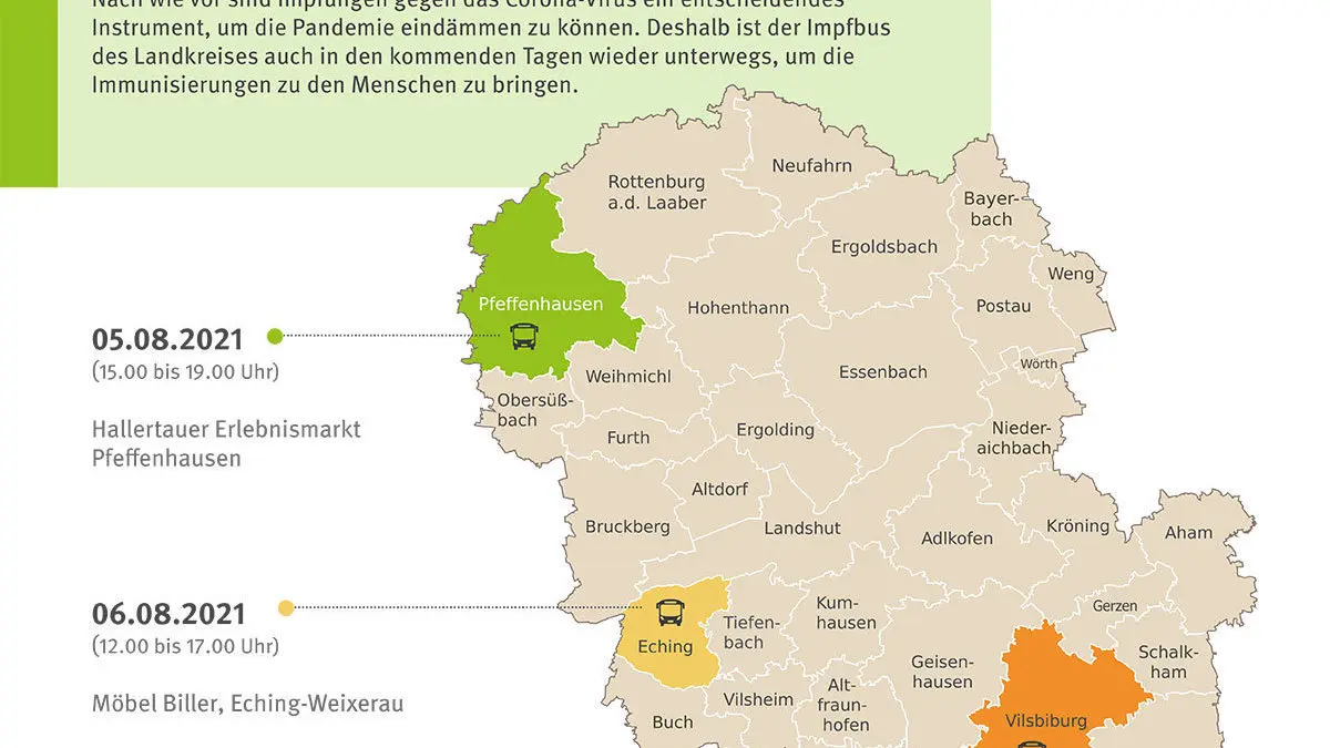 Am Freitag macht der Impfbus am Bauernmarkt bei Möbel Biller in Eching-Weixerau Halt (12 bis 17 Uhr), am Samstag ist der Wochenmarkt in Vilsbiburg von 7 bis 12 Uhr das Ziel. Auch hier stehen beide Präparate zur Verfügung.