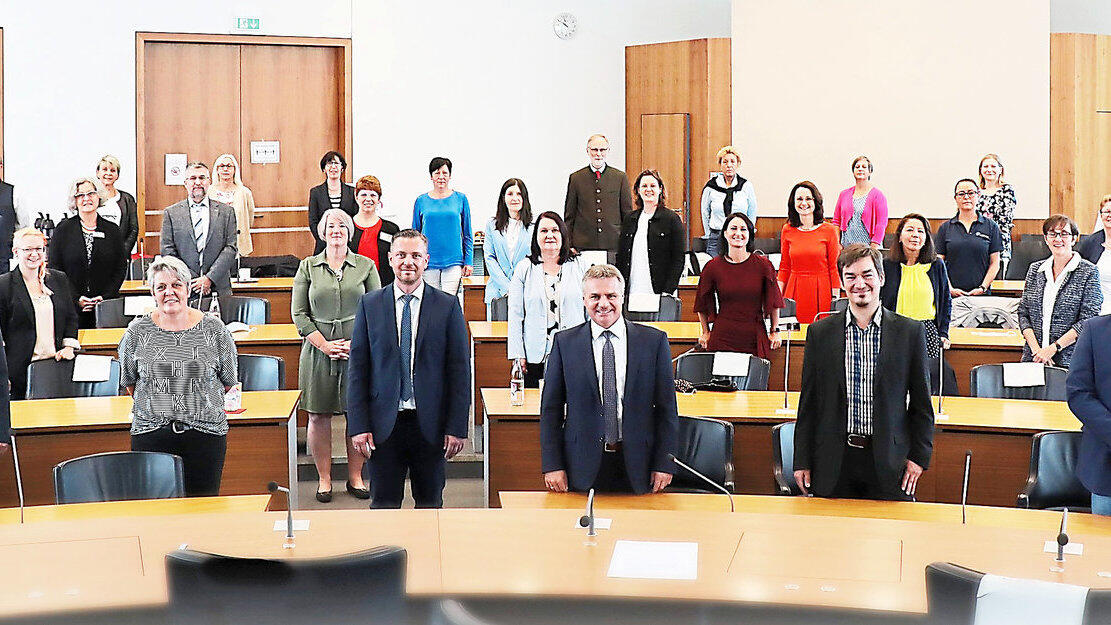 Landrat Peter Dreier ( 3.v.r. vorne) und die Vertreter von mehr als 20 Einrichtungen besiegelten am Freitag die Gründung des "Kompetenzverbundes für Ausbildung in der Pflege".