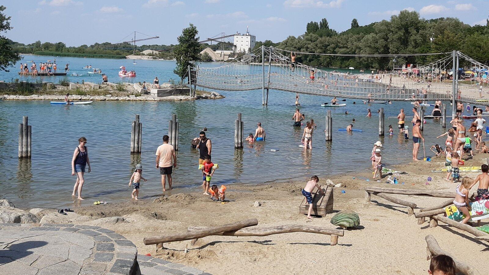 Der Sandstrand ist vor allem bei kleinen Kindern beliebt. Bis zu den Holzphählen geht der Nichtschwimmerbereich. Im Hintergrund eine der Naturinseln, die durch eine seit 2021 gesperrte Hängebrücke mit dem Ufer verbunden ist. Zur Holzinsel weiter draußen muss man schwimmen. Am Horizont sieht man das Kiesabbauwerk, das dem See seinen Namen gibt.