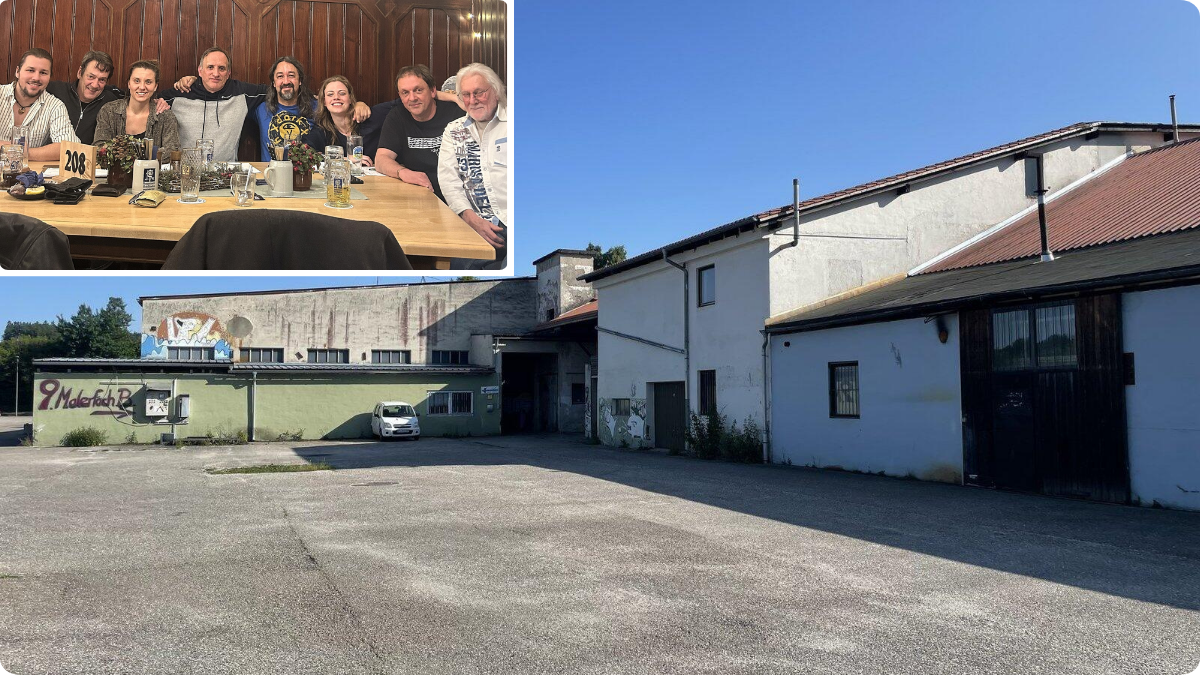 Nach dem Rauswurf aus der Alten Ziegelei Kumhausen (Bild im Hintergrund) wollen sie Künstler vernetzen - untereinander und mit der regionalen Gastronomie (oben links): Die Gründungsmitglieder vom Verein „Musik und Kultur in Landshut“ (MUKL).