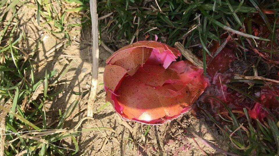 Bettina und Arnd Wängler haben am 31. März in Langenvils beim spazieren gehen mit ihren vier Huskys ein aufgeschlagenes, rot gefärbtes Hühnerei gefunden.