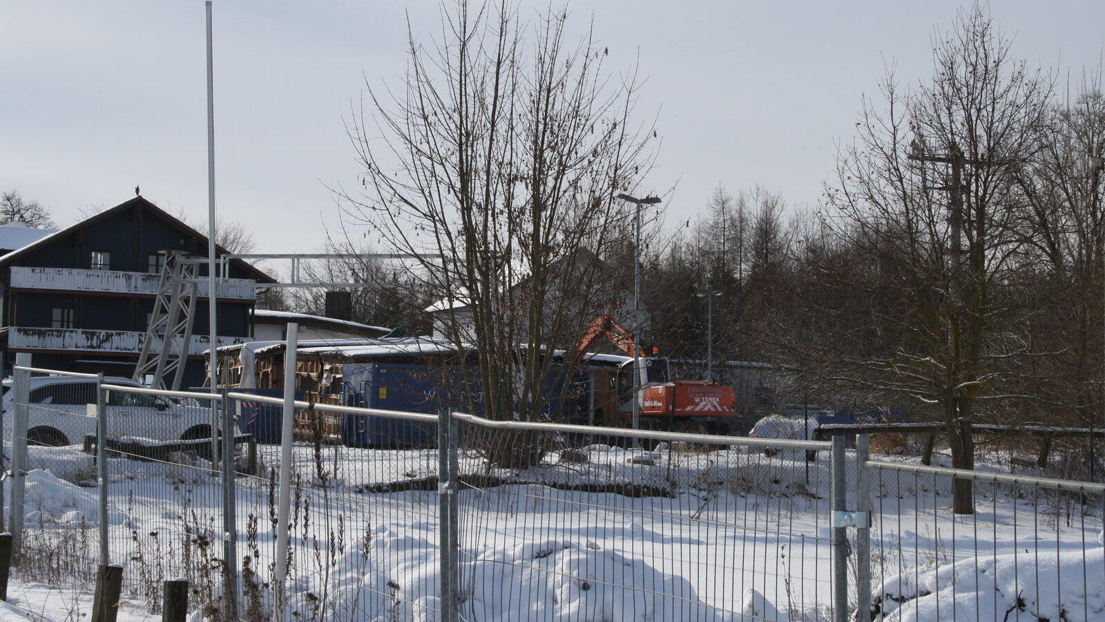 Im vorderen Teil des Geländes sind die Abbauarbeiten der verpackten Anlage schon angelaufen. Die gut 50 aufgebauten Container im hinteren Bereich des Geländes waren lange Zeit durch Bauzäune am Parkplatz der ehemaligen Diskothek nicht erreichbar.