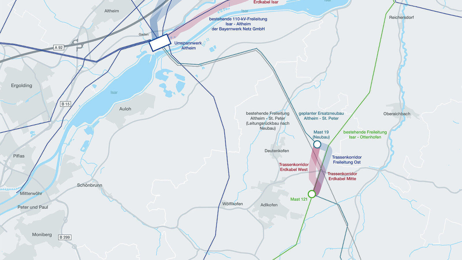 Für die Leitung vom Netzverknüpfungspunkt Isar zum Umspannwerk Altheim (P77) wird kein Raumordnungsverfahren notwendig sein, weil es sich bei der geplanten 380-kV-Leitung Isar - Altheim (plus Teilstück Adlkofen) nicht