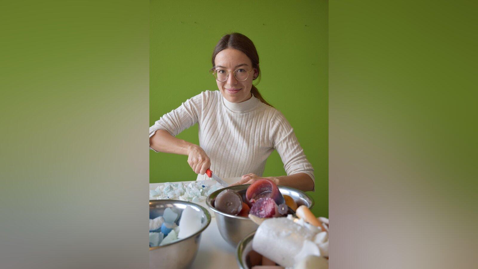 Katharina Kammhuber zerkleinert Restwachs, damit es im Wasserbad leichter schmilzt.