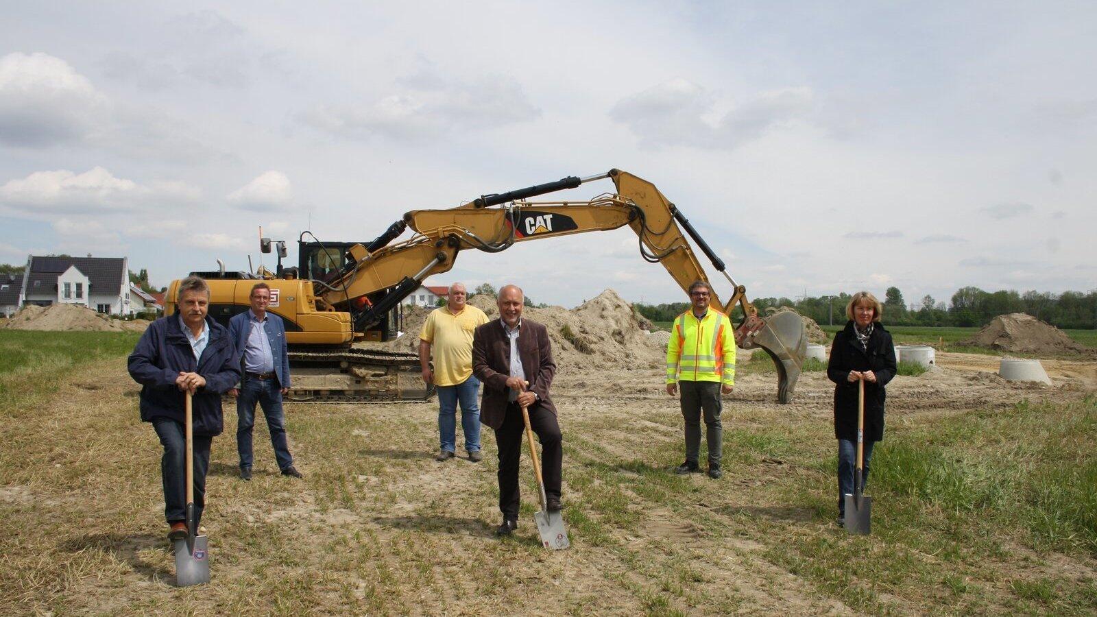 Alle Beteiligten - Vertreter der KFB, Strabit und vom Planungsbüro Niedenzu - mit Bürgermeister Stefan Scheibenzuber (vorne Mitte) und Grundbesitzerin Sabine Meierlohr-Solowski beim Spatenstich im neuen Baugebiet.