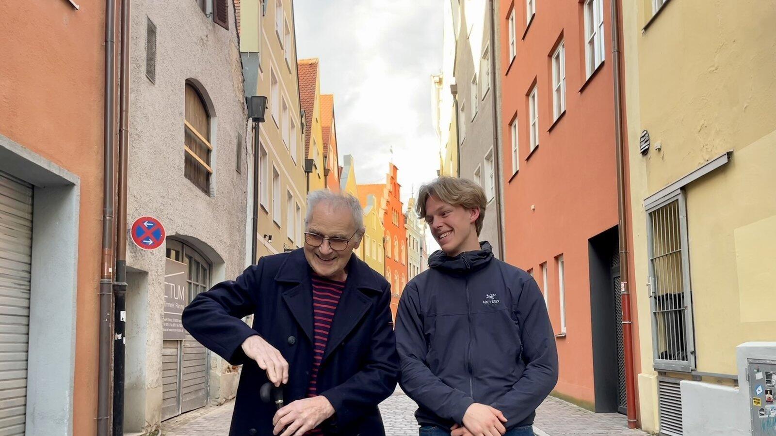 Lachen über einen Scherz: Der frühere Lehrer Hermann Stieß (l.) und dessen Retter, Schüler Uli Huber, beide aus der Gemeinde Kumhausen, kamen zum Foto in die Landshuter Ländgasse. Mit der Gehhilfe deutete Stieß zuvor ein Gewehr an und zielte imaginär auf den Fasan, der 2023 einen schweren Fahrradunfall des Pensionisten verursachte.