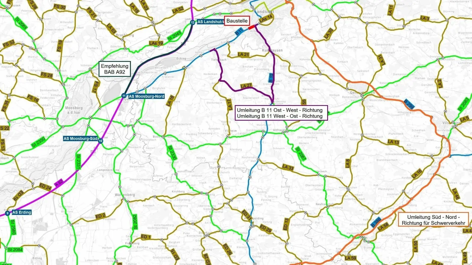 Wie erwartet wirkt sich die Sperrung der B11 auf den Verkehrsfluss in und um Landshut aus, heißt es in der Mitteilung. Der B11-Verkehr wird über Tiefenbach und Ast nach Hachelstuhl und dann über die B15 nach Landshut erfolgen. In Gegenrichtung gilt die gleiche Umleitungsstrecke. Zudem verweist das Bauamt auf die Umleitungsempfehlung über die A92, die AS Landshut-West und die Münchnerau nach Landshut.