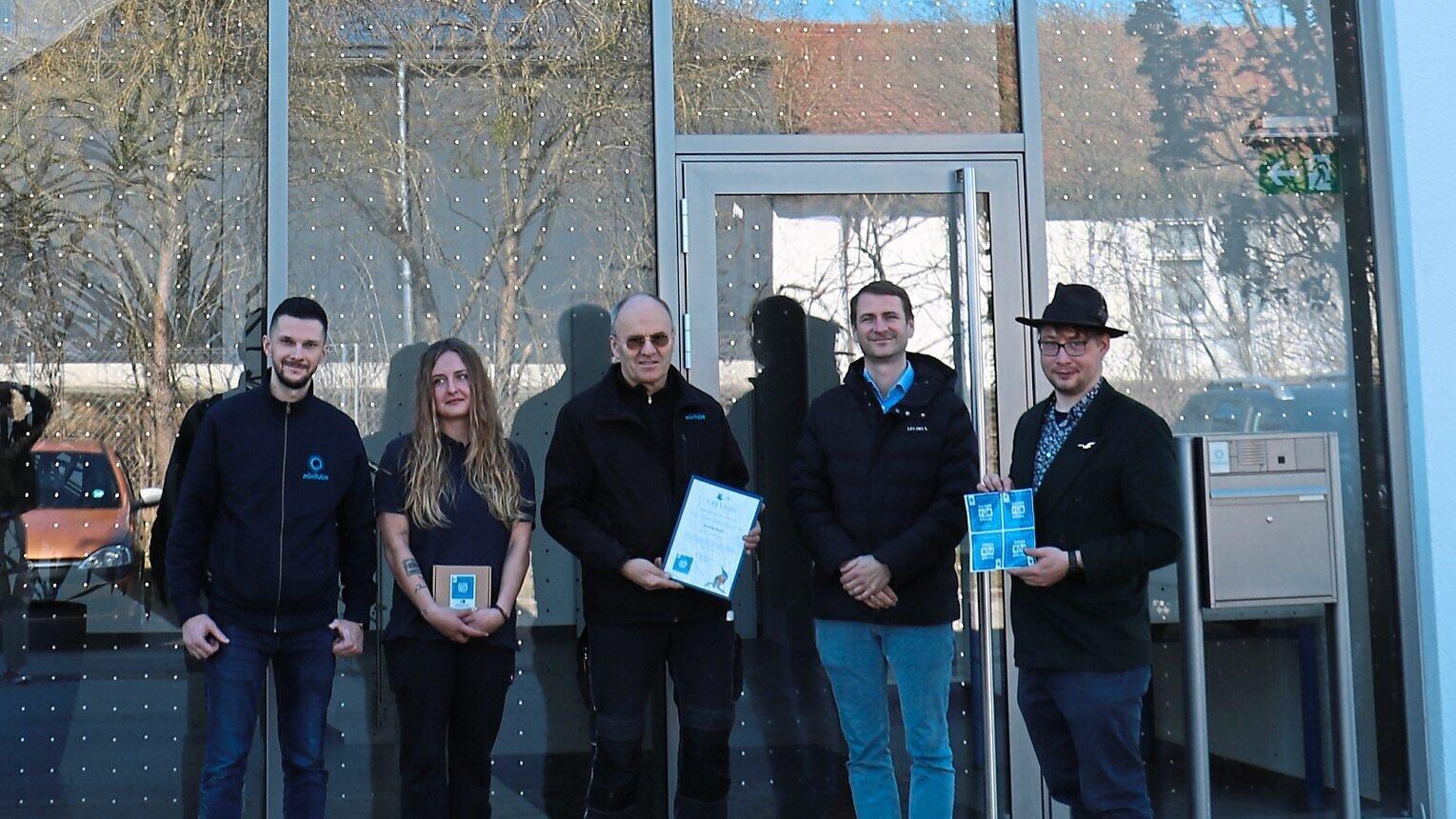 Peter Stimmler vom LBV (r.) zusammen mit den Minitüb-Mitarbeitern Florim Latifi (v.l.), Nelly Zweckl, Hans-Peter Bauer und Thomas Haslbeck vor der "vogelfreundlichen Glasfläche".