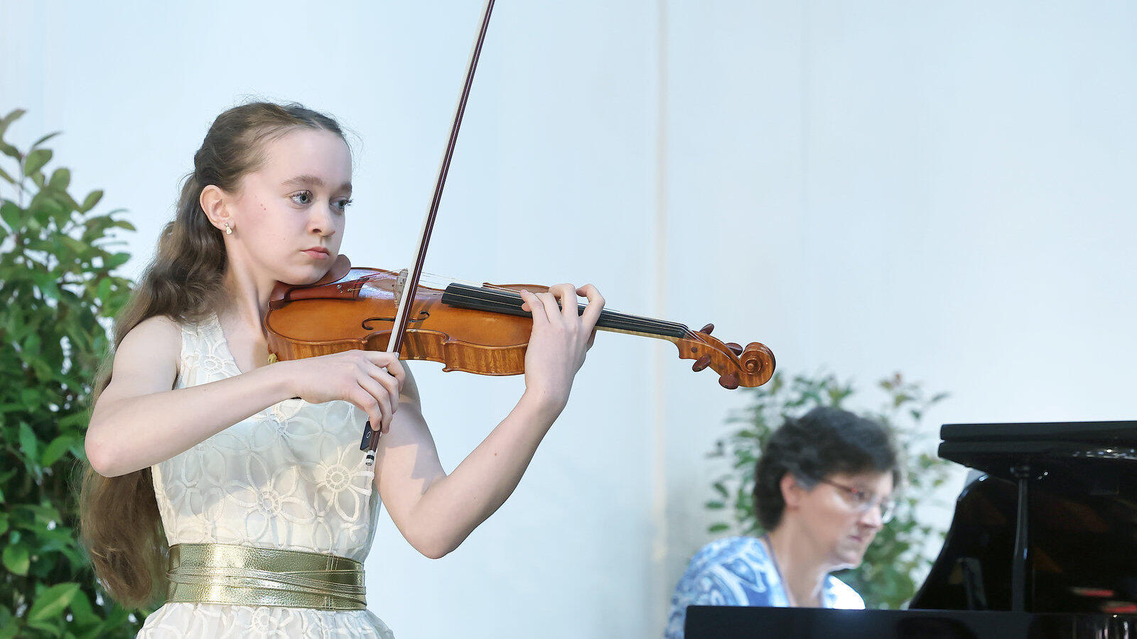 Hoch konzentriert, doch mit viel Ausdruck und Emotion trug Valentina-Maria Schwinge bei der Preisverleihung in der Heilig-Kreuz-Kirche Stücke von Komponisten wie Bach, Beethoven oder Vivaldi vor. Begleitet wurde sie dabei von der stellvertretenden Leiterin der Städtischen Musikschule, Tanja Wagner.