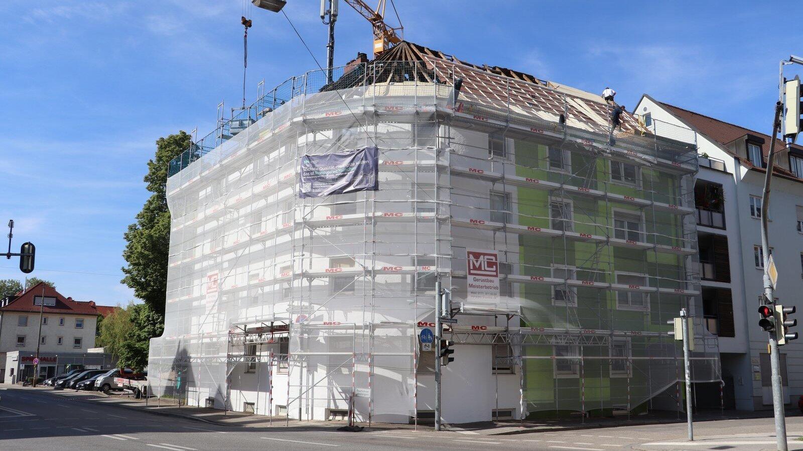 Das Grün verschwindet und auch das Dach wird erneuert. Derzeit laufen die Arbeiten am Grünen Haus.
