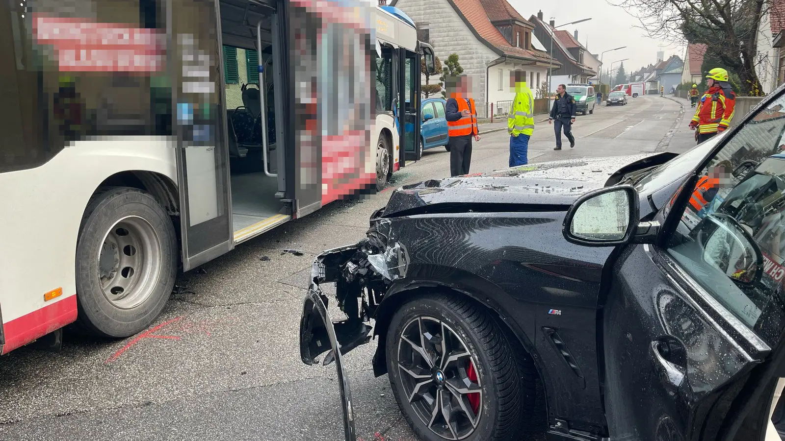 Nach erster Sichtung durch die Rettungskräfte waren im Bus zwei Personen sowie die Fahrerin des Autos durch Sanitäter der Feuerwehr zu betreuen.
