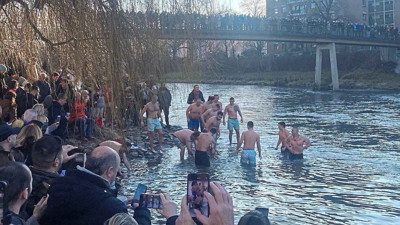 Junge Männer stürzen sich unter dem Jubel der Zuschauer in die fünf Grad kalte Isar, um nach dem sogenannten "ehrenvollen Kreuz" zu tauchen. Organisiert wurde die Veranstaltung von der serbisch-orthodoxen Gemeinde.