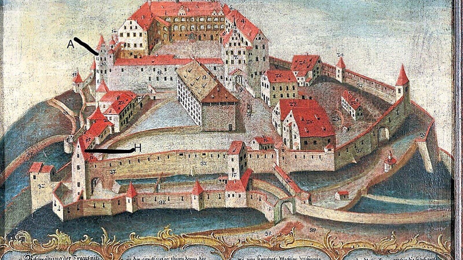 Auf dem Gemälde eines unbekannten Malers von 1770 ist das damals als Arrestantenturm (A) bezeichnete Verlies (heute Wittelsbacher Turm) sowie der sogenannte Hungerturm (H) zu sehen, in dem Claus Felbinger vermutlich gefangen gehalten wurde.