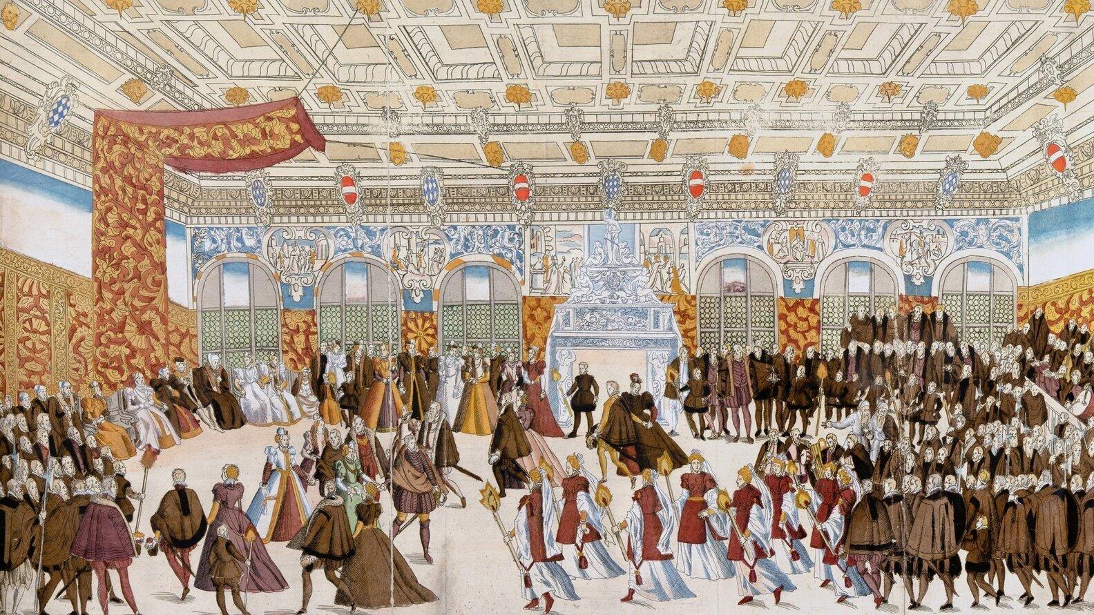 Ein Stich von Nikolaus Solis zeigt die herzogliche Hochzeit von 1568 mit „Tanz und Mummerei“.