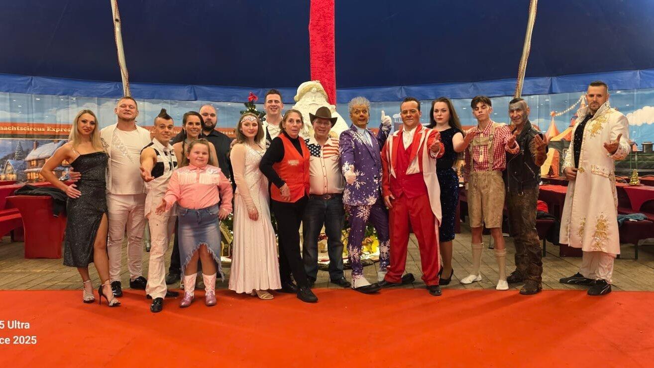 Artisten mit Leib und Seele: Remo Frank (Achter von links) ist Zirkusdirektor in siebter Generation. Er und seine Familie kämpfen dafür, dass sein Circus La Strada auch künftig in Landshut Zirkusfreunde über die Weihnachtstage unterhalten kann.