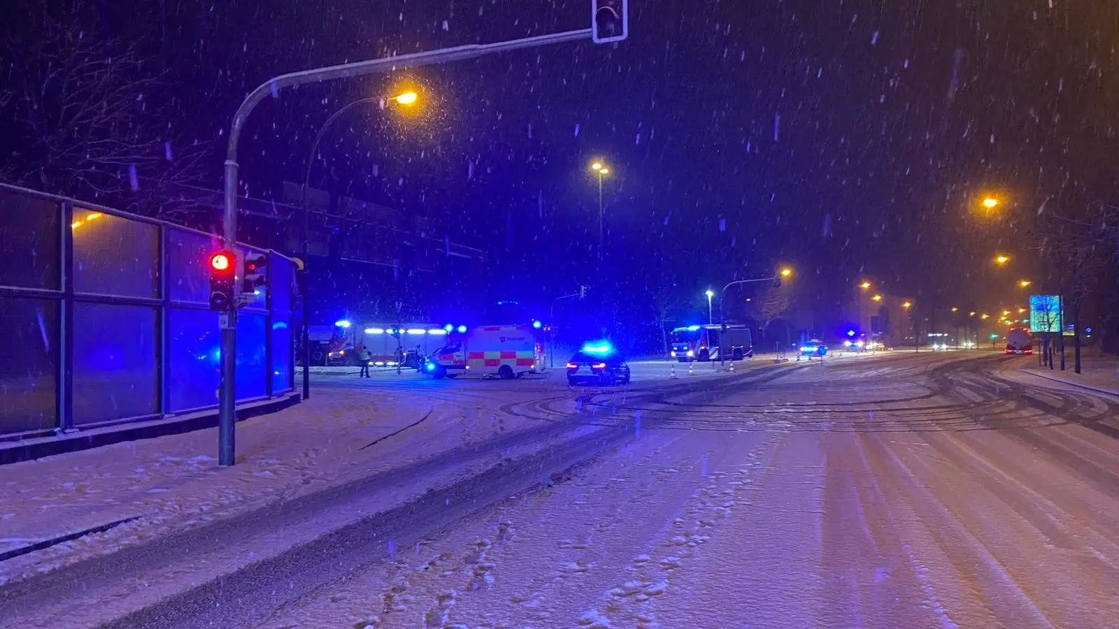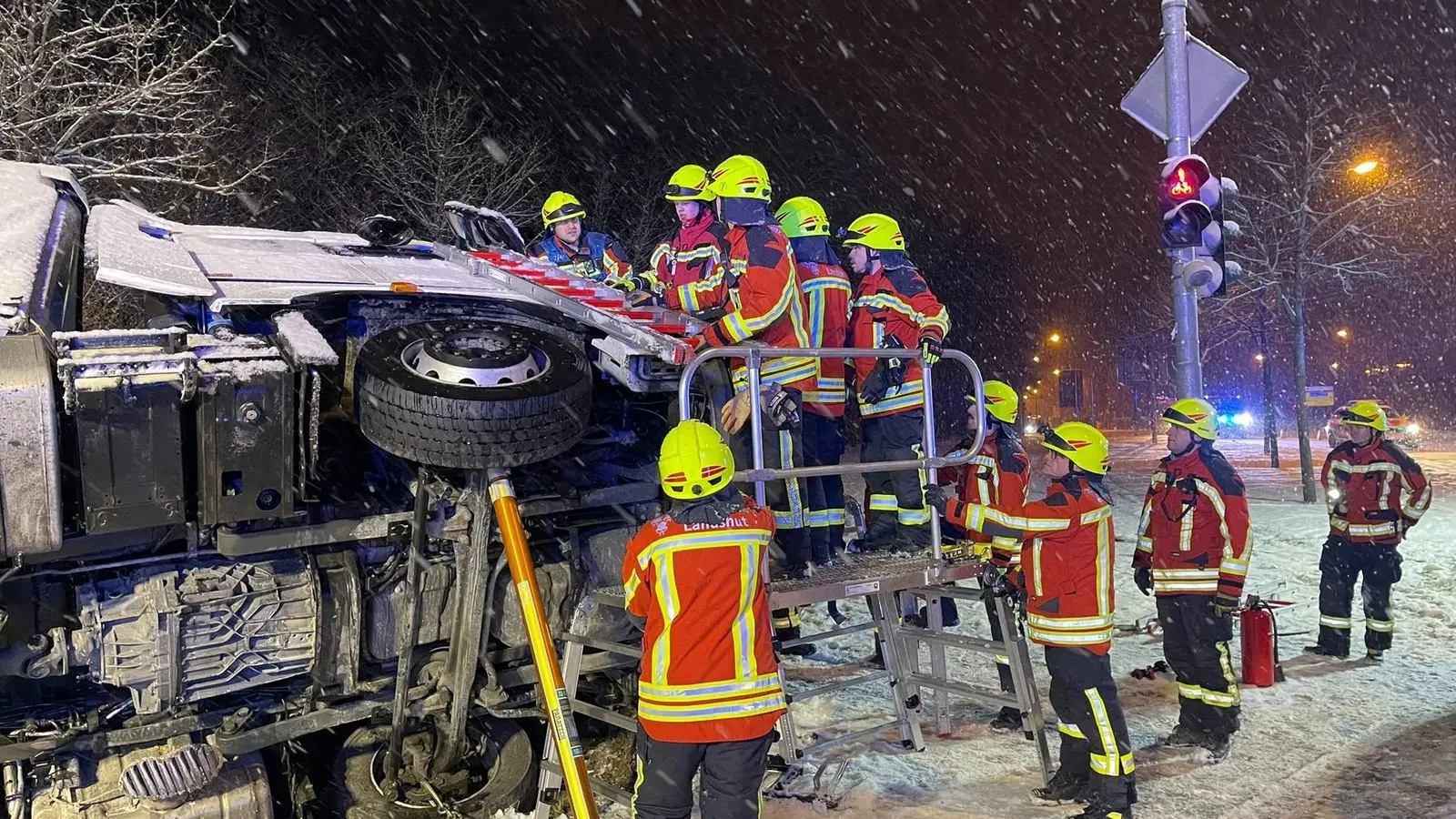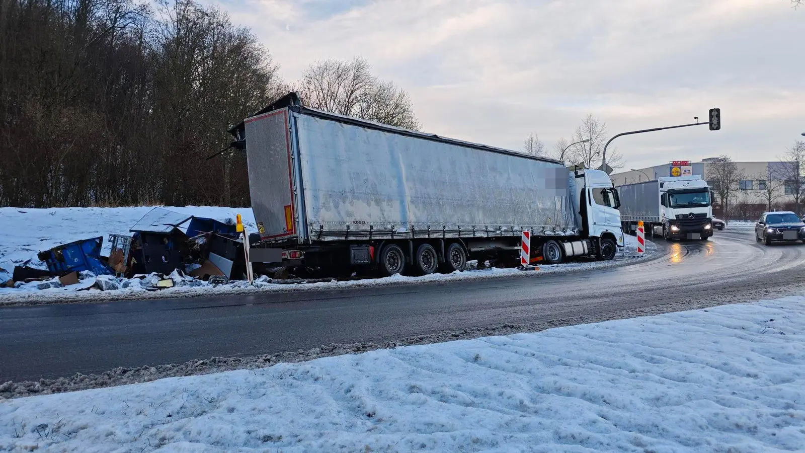 Auf der B299 am Kaserneneck in Landshut hat am späten Donnerstagabend ein von Vilsbiburg kommender Lastwagenfahrer aufgrund der Glätte bergab die Kontrolle über das Fahrzeug verloren.