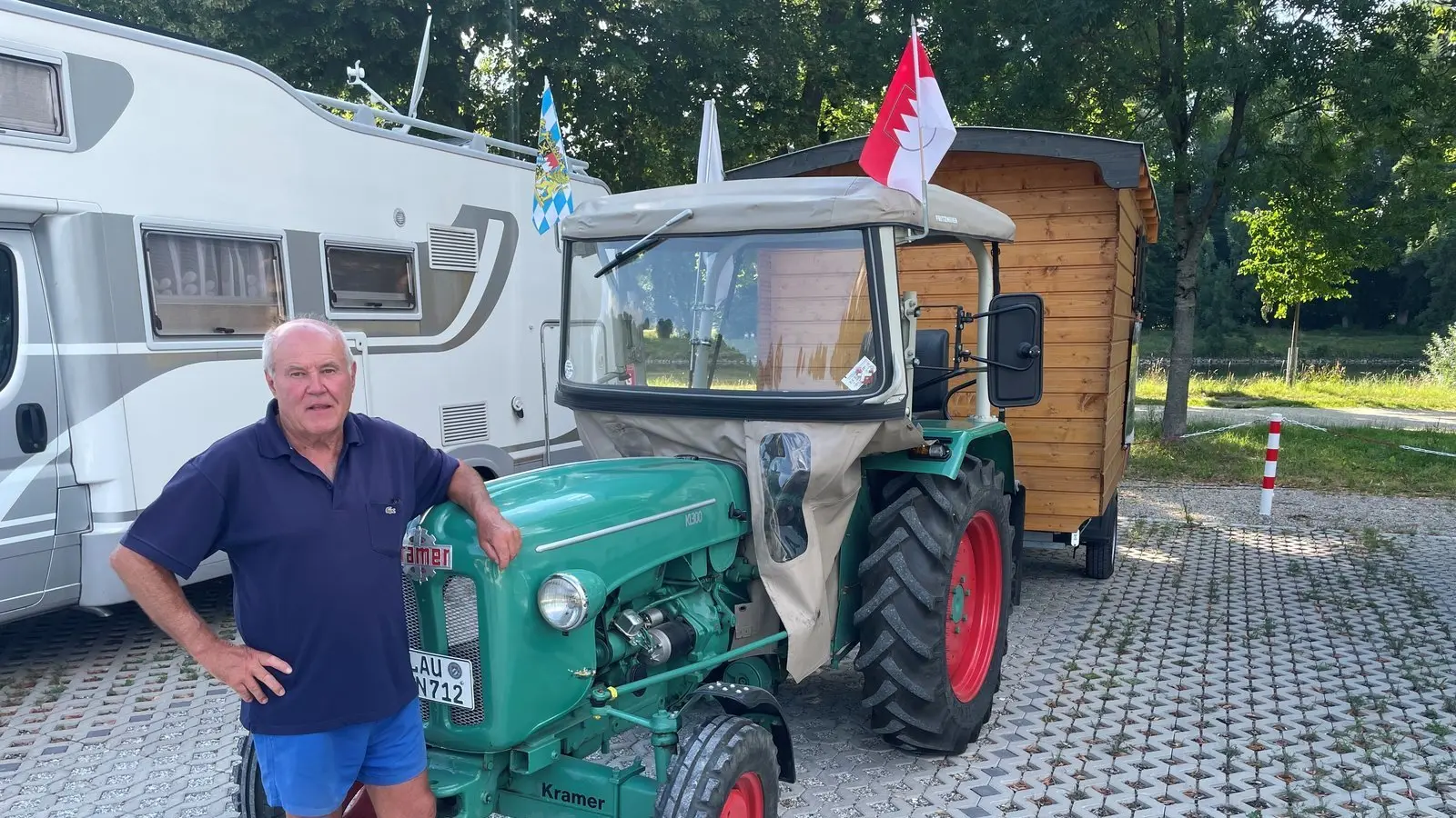 Ein seltsames Gespann hat auf der Grieserwiese halt gemacht. Dort, wo sich sonst schneeweiße Wohnmobile von beachtlicher Größe breitmachen, zwängte sich ein kleiner grüner Traktor in eine Lücke. Hinten dran ein hölzerner Anhänger, dahinter wiederum der 71-jährige Georg Kölbel aus Lauf an der Pegnitz im Liegestuhl. Der legte dort nach einem mehrstündigen Trip die Beine hoch und entspannte bei einer Brotzeit mit Blick auf die gemächlich dahinfließende Isar nach einer stundenlangen Fahrt, um Kraft für den nächsten Tag zu tanken: „Mein Ziel ist der Großglockner“, erzählt der Mittelfranke.