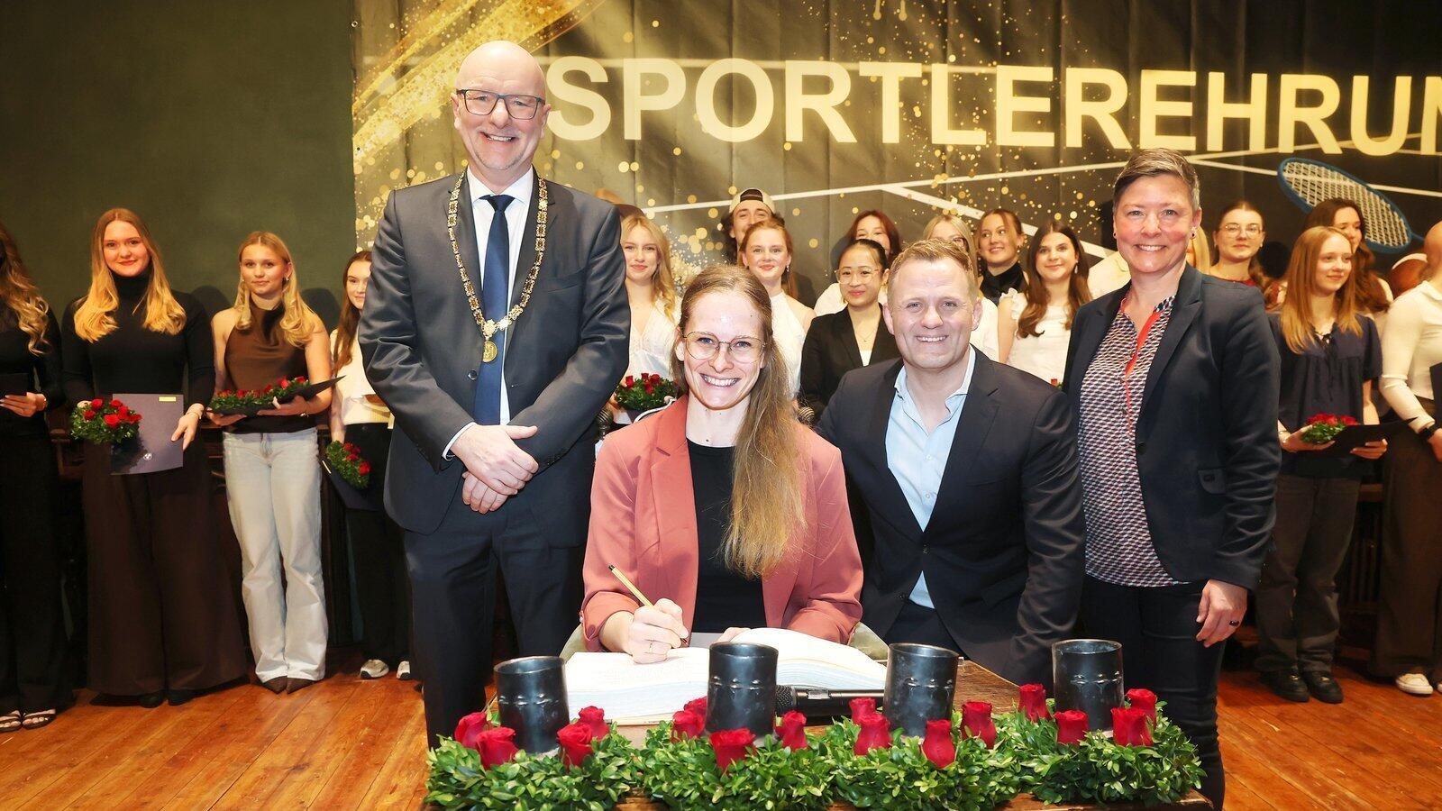 Die Showtanzgruppe „Intoxication“ bekam eine Ehrung der Meisterklasse. Tanja Kollmannsberger (vorne links) trägt sich für die Gruppe ins goldene Sportbuch der Stadt ein. Die Ehrungen verliehen Oberbürgermeister Alexander Putz, Ehrengast Ole Bischof und die Sportbeauftragte der Stadt Sabrina Högl (vorne v.l.).